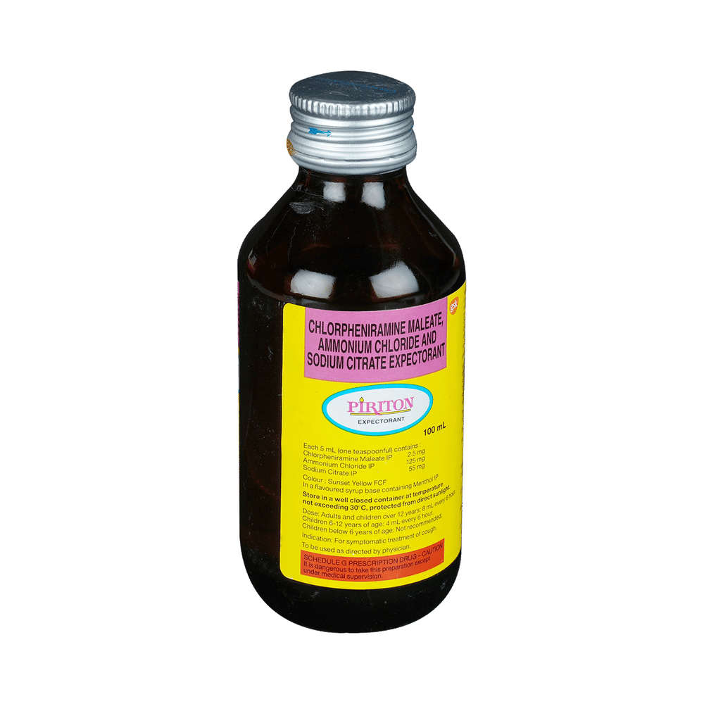 Piriton Expectorant is a combination medicine used to treat cough. It thins the mucus in the nose, making it easier to cough out. This medicine also relieves allergic symptoms like runny nose, watery eyes, sneezing, throat irritation. Piriton Expectorant is taken with or without food in a dose and duration as advised by the doctor. The dose you are given will depend on your condition and how you respond to the medicine. You should keep taking this medicine for as long as your doctor recommends. If you stop treatment too early your symptoms may come back and your condition may worsen. Let your healthcare team know about all other medications you are taking as some may affect, or be affected by this medicine.The most common side effects are allergic reaction and rash. Most of these are temporary and usually resolve with time. Contact your doctor straight away if you are at all concerned about any of these side effects. This medicine can also cause sleepiness, so do not drive or do anything that requires mental focus until you know how this medicine affects you. Avoid drinking alcohol while taking this medicine as it can make sleepiness worse.Never support self-medication or recommend your medicine to another person. It is beneficial to have plenty of fluids while taking this medication. Before taking this medicine, you should tell your doctor if you are pregnant, planning pregnancy or breastfeeding. You should tell your doctor if you have any kidney or liver diseases so that your doctor can prescribe a suitable dose for you.