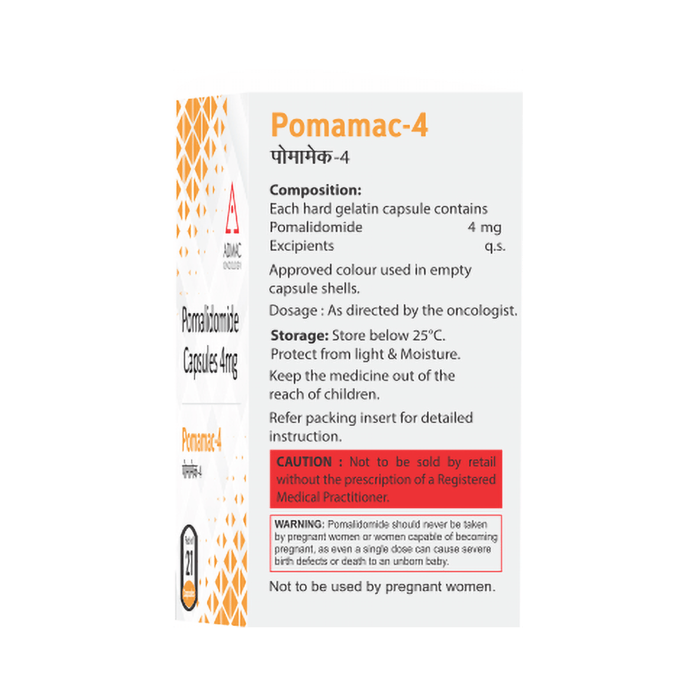 Pomamac 4 Capsule is used in the treatment of multiple myeloma and is used in combination with some other medicine (dexamethasone). It works by helping the bone marrow to produce normal blood cells and by killing abnormal cells. Pomamac 4 Capsule can be taken with or without food, but better to take it at the same time every day. Your doctor will decide what dose is necessary and how often you need to take it. This will depend on what you are being treated for and may change from time to time. You should take it exactly as your doctor has advised. Taking it in the wrong way or taking too much can cause very serious side effects. It may take several weeks or months for you to see or feel the benefits but do not stop taking it unless your doctor tells you to.The most common side effects of this medicine include fatigue, fever, bone pain, muscle cramp, and diarrhea. This medicine may reduce the number of blood cells (decrease red blood and white blood cells) in your blood, thereby, increasing the susceptibility to infections. Regular blood tests are required to check your blood cells along with heart, liver, and blood uric acid levels.Many other medicines can affect, or be affected by, this medicine so let your healthcare team know all medications you are using. This medicine is not recommended during pregnancy or while breastfeeding. The use of effective contraception by both males and females during treatment is important to avoid pregnancy. It makes your skin more sensitive towards sunlight, take caution while stepping out or wear protective clothing.