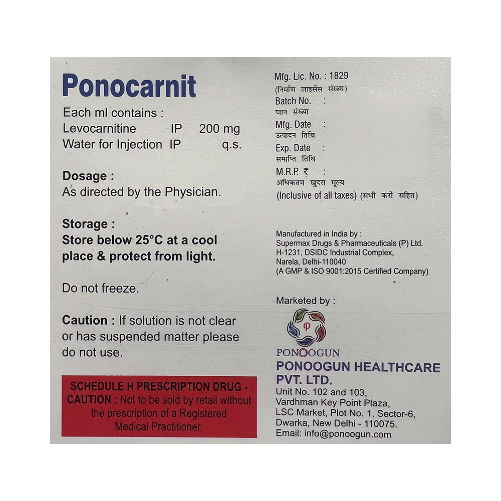 Ponocarnit Injection belongs to a class of medications called amino acids. It is used in the treatment of carnitine deficiency. It helps the body produce energy and improves the efficiency of body function. Ponocarnit Injection is generally administered by a healthcare professional. You should not self-administer this at home. It may cause injection site reactions like pain, swelling, redness that are generally mild and temporary.Ponocarnit Injection is usually a safe medicine, however, it may cause nausea, vomiting, diarrhea, abdominal pain, and reactions at the site of injection such as swelling, redness, and pain. Your doctor may monitor your blood glucose levels regularly while you are taking the medicine.Before starting the medicine, inform your doctor if you have any other medical conditions or are taking any other medications. Patients with severe kidney disease should not take this medicine unless prescribed by the doctor.
