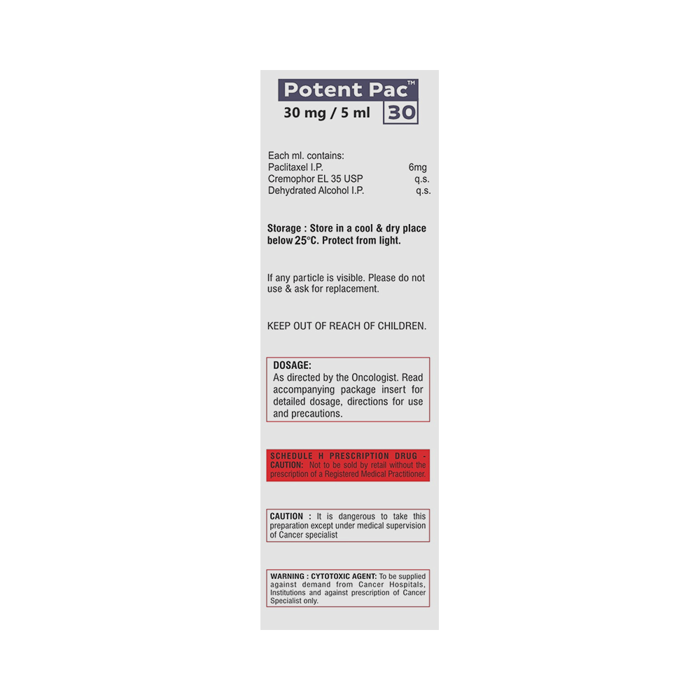 Potent Pac 30 Injection is an anti-cancer medication used for the treatment of breast cancer, pancreatic cancer and non-small cell lung cancer. It is given as an injection by a qualified medical professional. Your doctor will decide what dose is necessary and how often you need to take it. This will depend on what you are being treated for and may change from time to time. You should take it exactly as your doctor has advised. Taking it in the wrong way or taking too much can cause very serious side effects. It may take several weeks or months for you to see or feel the benefits but do not stop taking it unless your doctor tells you to.Some common side effects of this medicine include nausea, vomiting, and weakness. It may also cause serious side effects such as swelling of hands, lips, hair loss, and weight gain. To reduce these side effects your doctor may suggest some medication along with it. But, inform your doctor if you notice unexplained bruising or bleeding, sore throat, mouth ulcers, high temperature (fever). This medicine may reduce the number of blood cells (decrease red blood and white blood cells) in your blood, thereby, increasing the susceptibility to infections. Regular blood tests are required to check your blood cells and liver function.Before taking it, tell your doctor if you have heart disease, liver, or kidney problems or are taking any medicines to treat infections. Many other medicines can affect, or be affected by, this medicine so let your doctor know all medications you are using. This medicine is not recommended during pregnancy or while breastfeeding. The use of effective contraception by both males and females during treatment is important to avoid pregnancy.