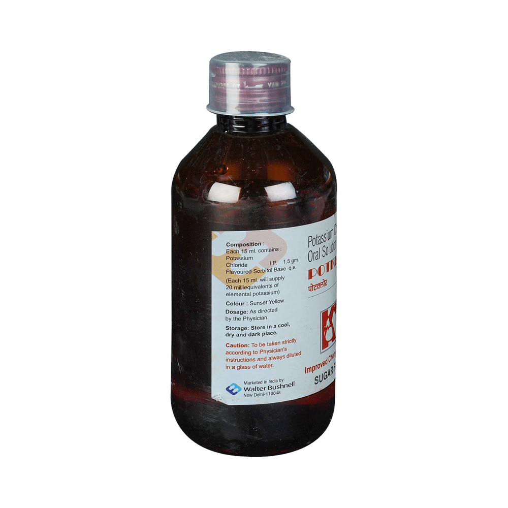 Potklor Oral Solution Cherry Sugar Free is a medicine used to treat potassium deficiency in the body. It is used in patients whose dietary management with potassium-rich foods are not enough. Potassium is an essential nutrient of the body which helps in the maintenance of good health. Potklor Oral Solution Cherry Sugar Free is best taken with food. Take it in the dose and duration as advised by your doctor. Take it regularly and at the same time each day for maximum benefits. Continue taking the medicine until the doctor tells you it is okay to stop.This medicine is usually well-tolerated, however, it may cause nausea, vomiting, flatulence, abdominal pain, and diarrhea in some people. Consult your doctor if any of the side effects persist or get worse. They may be able to suggest ways to reduce or prevent the side effects.Before taking this medicine, let your doctor know if you have any preexisting medical conditions. Let your doctor also know all the medicines you are taking to make sure it is safe for you.