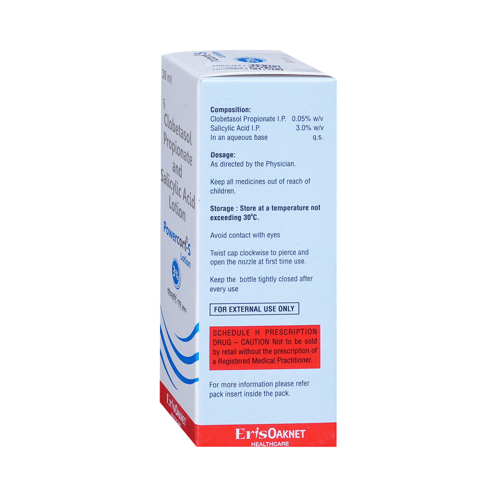 Powercort-S Lotion has a combination of medicines that are used to treat eczema and psoriasis. It helps to provide relief from redness, itching, and swelling. It removes dead skin cells and helps in softening the skin. Powercort-S Lotion should be used in the dose and duration as advised by your doctor. Wash your hands before using this medicine. It is advised to check the label for directions before use. It is for external use only.Do not use this medicine more than the recommended dose. Inform your doctor if you have known allergies to this medicine. The common side effects of this medicine include peeling of the skin, thinning of the skin, burning, itching, irritation, and redness at the application site.If these side effects or any other symptoms which you think are because of this medicine persist for a longer duration, please consult your doctor. Inform your doctor if you are pregnant or are suffering from any other disease. This medicine is safe to use in breastfeeding mothers.