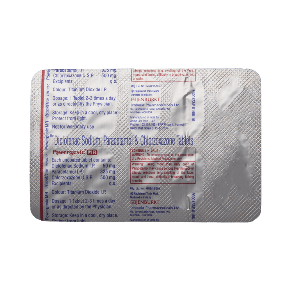 In Treatment of Pain due to muscle spasmPowergesic MR Tablet is a combination medicine that is used to relieve pain, inflammation, and swelling in conditions that affect muscles. Also, it effectively relieves muscle stiffness or spasm, thereby improving muscle movement. It works by blocking chemical messengers in the brain that tell us we have pain.Take it as it is prescribed to get the most benefit. Do not take more or longer than needed as that can be dangerous. In general, you should take the lowest dose that works, for the shortest possible time. This will help you to go about your daily activities more easily and have a better, more active, quality of life.