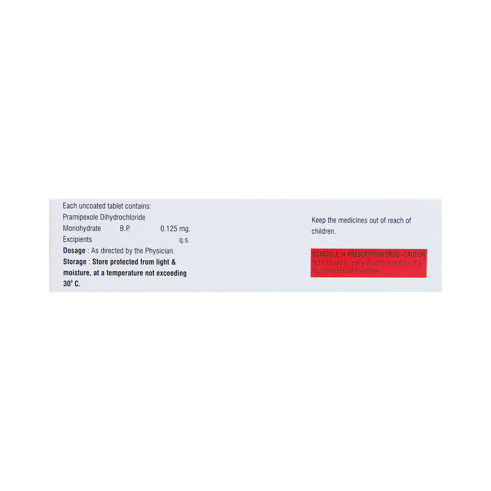 Pramiday 0.125 Tablet is used in the treatment of Parkinson's disease and restless leg syndrome (an urge to move the legs usually accompanied or caused by uncomfortable and unpleasant leg sensations). It helps to treat excessive shaking by slowing down the body movements. Pramiday 0.125 Tablet should be taken with food. However, take it at the same time each day as this helps to maintain a consistent level of medicine in the body. Take this medicine in the dose and duration as advised by your doctor and if you have missed a dose, take it as soon as you remember it. You should never skip any doses and finish the full course of treatment even if you feel better. This medication must not be stopped suddenly without talking to your doctor.Some common side effects of this medicine include nausea, dry mouth, fatigue, hallucinations, constipation, and peripheral edema. It also causes dizziness and sleepiness, so do not drive or do anything that requires mental focus until you know how this medicine affects you. Inform your doctor if you develop any unusual changes in mood, an abnormally high sex drive, an urge to gamble, or uncontrolled spending as these may prove very harmful.