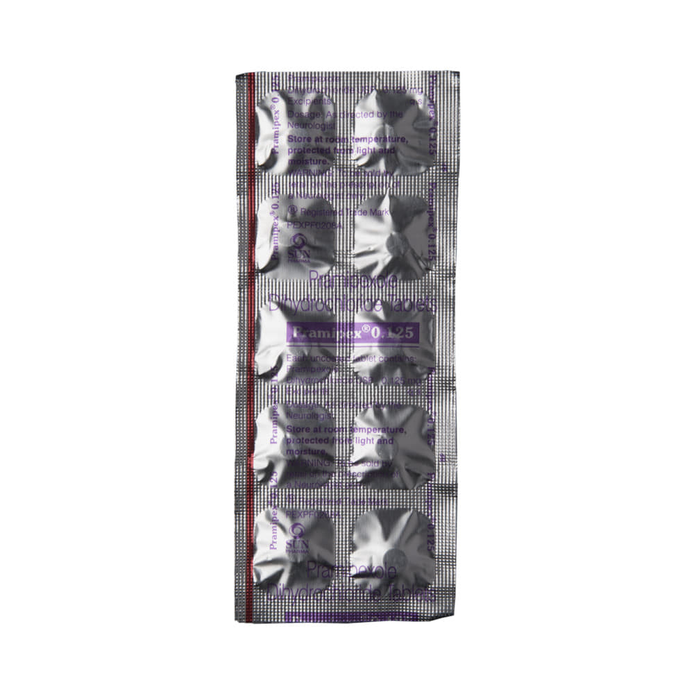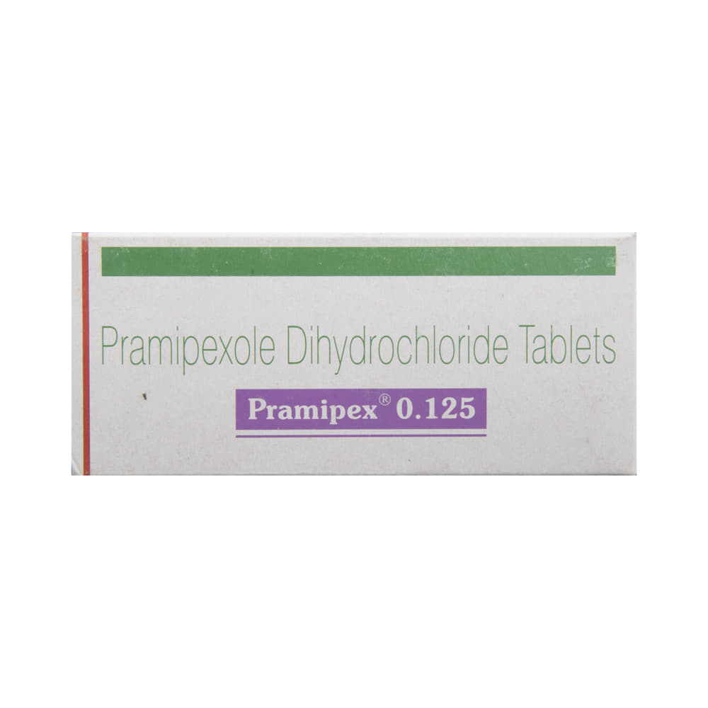 Pramipex 0.125 Tablet is used in the treatment of Parkinson's disease and restless leg syndrome (an urge to move the legs usually accompanied or caused by uncomfortable and unpleasant leg sensations). It helps to treat excessive shaking by slowing down the body movements. Pramipex 0.125 Tablet should be taken with food. However, take it at the same time each day as this helps to maintain a consistent level of medicine in the body. Take this medicine in the dose and duration as advised by your doctor and if you have missed a dose, take it as soon as you remember it. You should never skip any doses and finish the full course of treatment even if you feel better. This medication must not be stopped suddenly without talking to your doctor.Some common side effects of this medicine include nausea, dry mouth, fatigue, hallucinations, constipation, and peripheral edema. It also causes dizziness and sleepiness, so do not drive or do anything that requires mental focus until you know how this medicine affects you. Inform your doctor if you develop any unusual changes in mood, an abnormally high sex drive, an urge to gamble, or uncontrolled spending as these may prove very harmful.