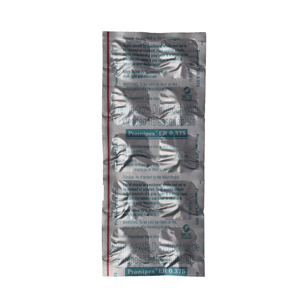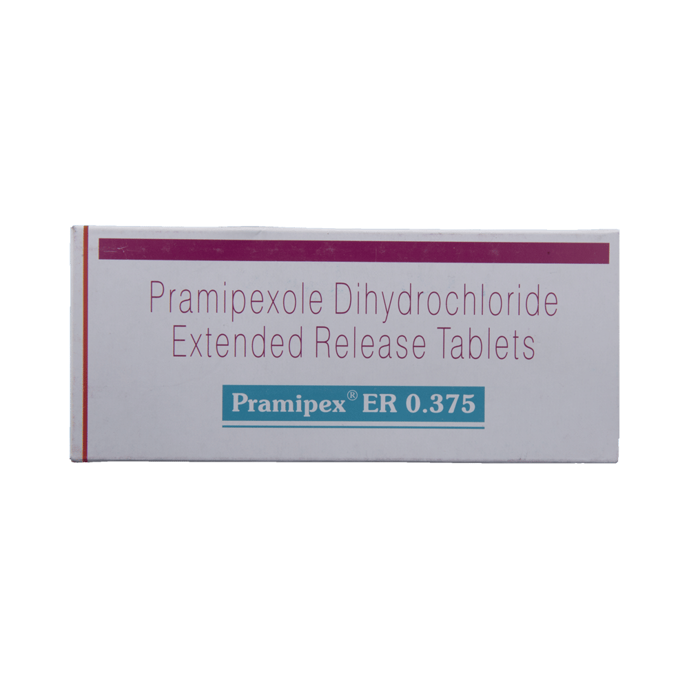 Pramipex ER 0.375 Tablet is used in the treatment of Parkinson's disease and restless leg syndrome (an urge to move the legs usually accompanied or caused by uncomfortable and unpleasant leg sensations). It helps to treat excessive shaking by slowing down the body movements. Pramipex ER 0.375 Tablet should be taken with food. However, take it at the same time each day as this helps to maintain a consistent level of medicine in the body. Take this medicine in the dose and duration as advised by your doctor and if you have missed a dose, take it as soon as you remember it. You should never skip any doses and finish the full course of treatment even if you feel better. This medication must not be stopped suddenly without talking to your doctor.Some common side effects of this medicine include nausea, dry mouth, fatigue, hallucinations, constipation, and peripheral edema. It also causes dizziness and sleepiness, so do not drive or do anything that requires mental focus until you know how this medicine affects you. Inform your doctor if you develop any unusual changes in mood, an abnormally high sex drive, an urge to gamble, or uncontrolled spending as these may prove very harmful.