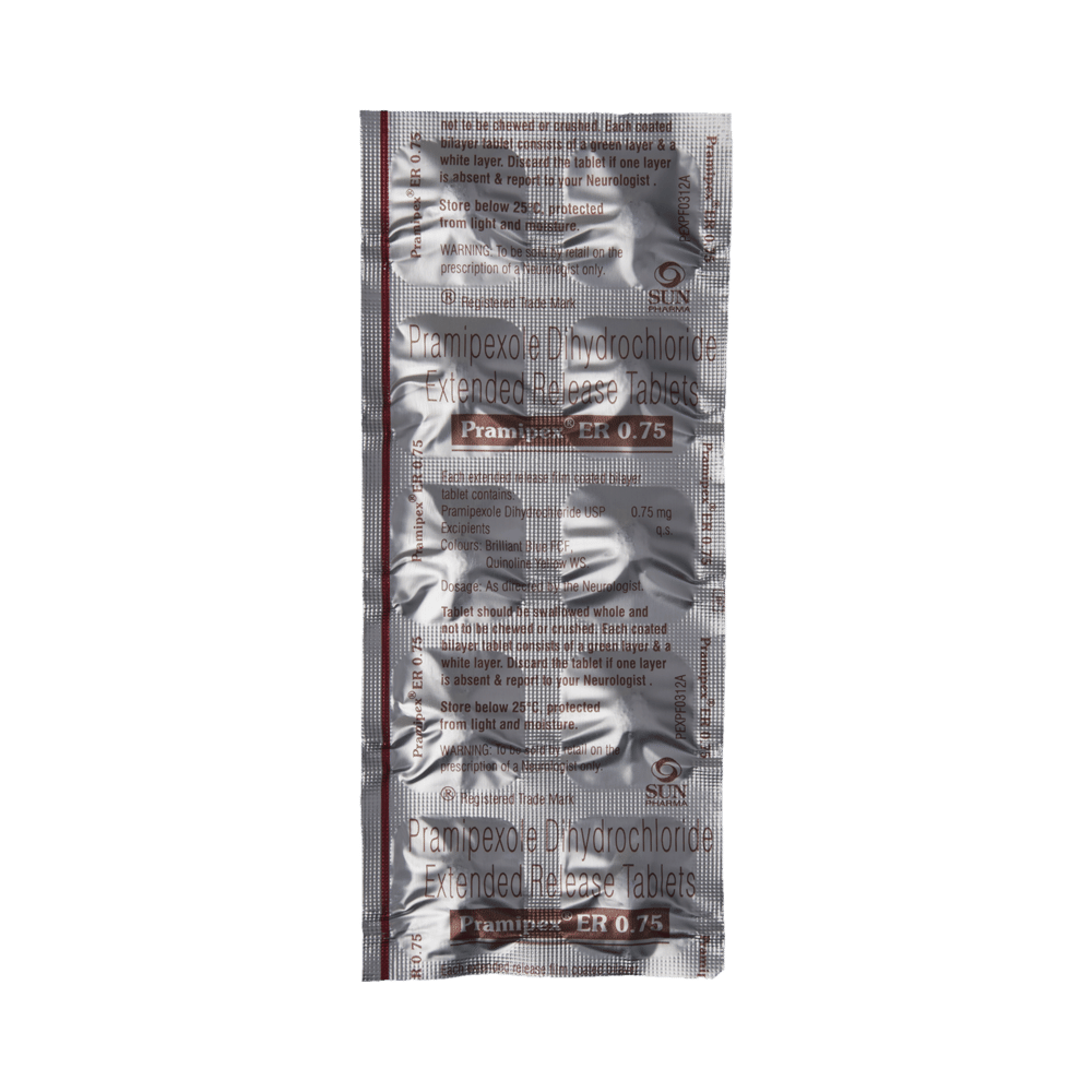 Pramipex ER 0.75 Tablet is used in the treatment of Parkinson's disease and restless leg syndrome (an urge to move the legs usually accompanied or caused by uncomfortable and unpleasant leg sensations). It helps to treat excessive shaking by slowing down the body movements. Pramipex ER 0.75 Tablet should be taken with food. However, take it at the same time each day as this helps to maintain a consistent level of medicine in the body. Take this medicine in the dose and duration as advised by your doctor and if you have missed a dose, take it as soon as you remember it. You should never skip any doses and finish the full course of treatment even if you feel better. This medication must not be stopped suddenly without talking to your doctor.Some common side effects of this medicine include nausea, dry mouth, fatigue, hallucinations, constipation, and peripheral edema. It also causes dizziness and sleepiness, so do not drive or do anything that requires mental focus until you know how this medicine affects you. Inform your doctor if you develop any unusual changes in mood, an abnormally high sex drive, an urge to gamble, or uncontrolled spending as these may prove very harmful.