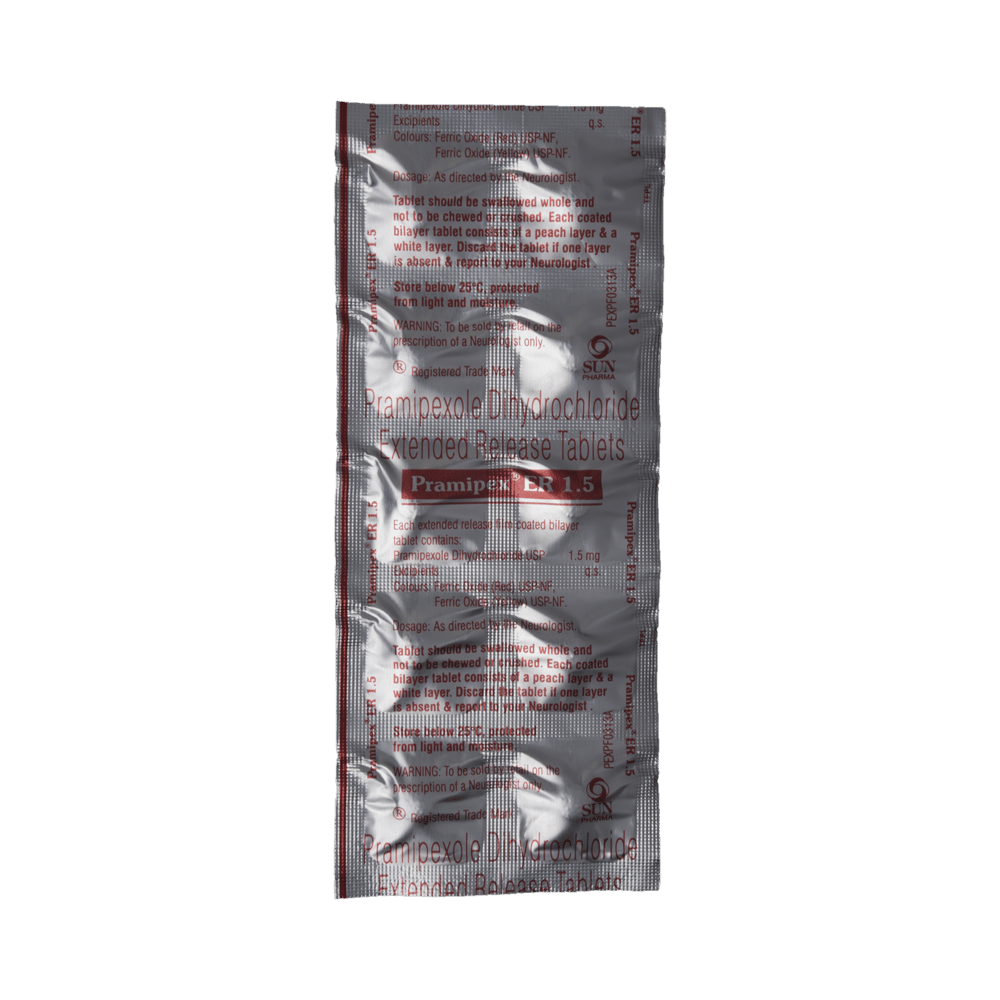 Pramipex ER 1.5 Tablet is used in the treatment of Parkinson's disease and restless leg syndrome (an urge to move the legs usually accompanied or caused by uncomfortable and unpleasant leg sensations). It helps to treat excessive shaking by slowing down the body movements. Pramipex ER 1.5 Tablet should be taken with food. However, take it at the same time each day as this helps to maintain a consistent level of medicine in the body. Take this medicine in the dose and duration as advised by your doctor and if you have missed a dose, take it as soon as you remember it. You should never skip any doses and finish the full course of treatment even if you feel better. This medication must not be stopped suddenly without talking to your doctor.Some common side effects of this medicine include nausea, dry mouth, fatigue, hallucinations, constipation, and peripheral edema. It also causes dizziness and sleepiness, so do not drive or do anything that requires mental focus until you know how this medicine affects you. Inform your doctor if you develop any unusual changes in mood, an abnormally high sex drive, an urge to gamble, or uncontrolled spending as these may prove very harmful.