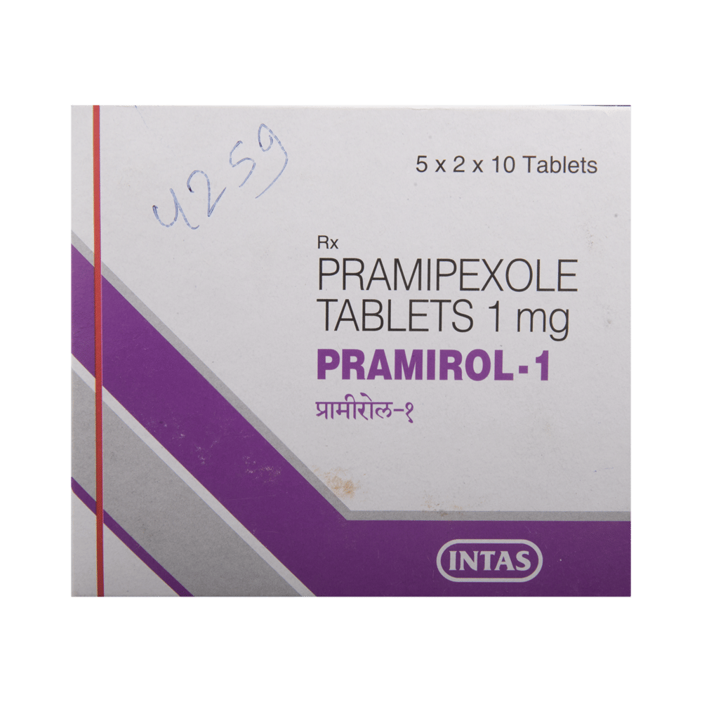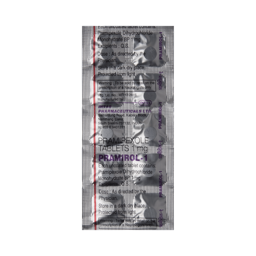 Pramirol 1 Tablet is used in the treatment of Parkinson's disease and restless leg syndrome (an urge to move the legs usually accompanied or caused by uncomfortable and unpleasant leg sensations). It helps to treat excessive shaking by slowing down the body movements. Pramirol 1 Tablet should be taken with food. However, take it at the same time each day as this helps to maintain a consistent level of medicine in the body. Take this medicine in the dose and duration as advised by your doctor and if you have missed a dose, take it as soon as you remember it. You should never skip any doses and finish the full course of treatment even if you feel better. This medication must not be stopped suddenly without talking to your doctor.Some common side effects of this medicine include nausea, dry mouth, fatigue, hallucinations, constipation, and peripheral edema. It also causes dizziness and sleepiness, so do not drive or do anything that requires mental focus until you know how this medicine affects you. Inform your doctor if you develop any unusual changes in mood, an abnormally high sex drive, an urge to gamble, or uncontrolled spending as these may prove very harmful.
