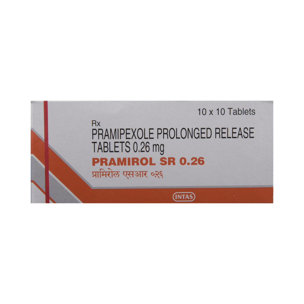 Pramirol SR 0.26 Tablet is used in the treatment of Parkinson's disease and restless leg syndrome (an urge to move the legs usually accompanied or caused by uncomfortable and unpleasant leg sensations). It helps to treat excessive shaking by slowing down the body movements. Pramirol SR 0.26 Tablet should be taken with food. However, take it at the same time each day as this helps to maintain a consistent level of medicine in the body. Take this medicine in the dose and duration as advised by your doctor and if you have missed a dose, take it as soon as you remember it. You should never skip any doses and finish the full course of treatment even if you feel better. This medication must not be stopped suddenly without talking to your doctor.Some common side effects of this medicine include nausea, dry mouth, fatigue, hallucinations, constipation, and peripheral edema. It also causes dizziness and sleepiness, so do not drive or do anything that requires mental focus until you know how this medicine affects you. Inform your doctor if you develop any unusual changes in mood, an abnormally high sex drive, an urge to gamble, or uncontrolled spending as these may prove very harmful.