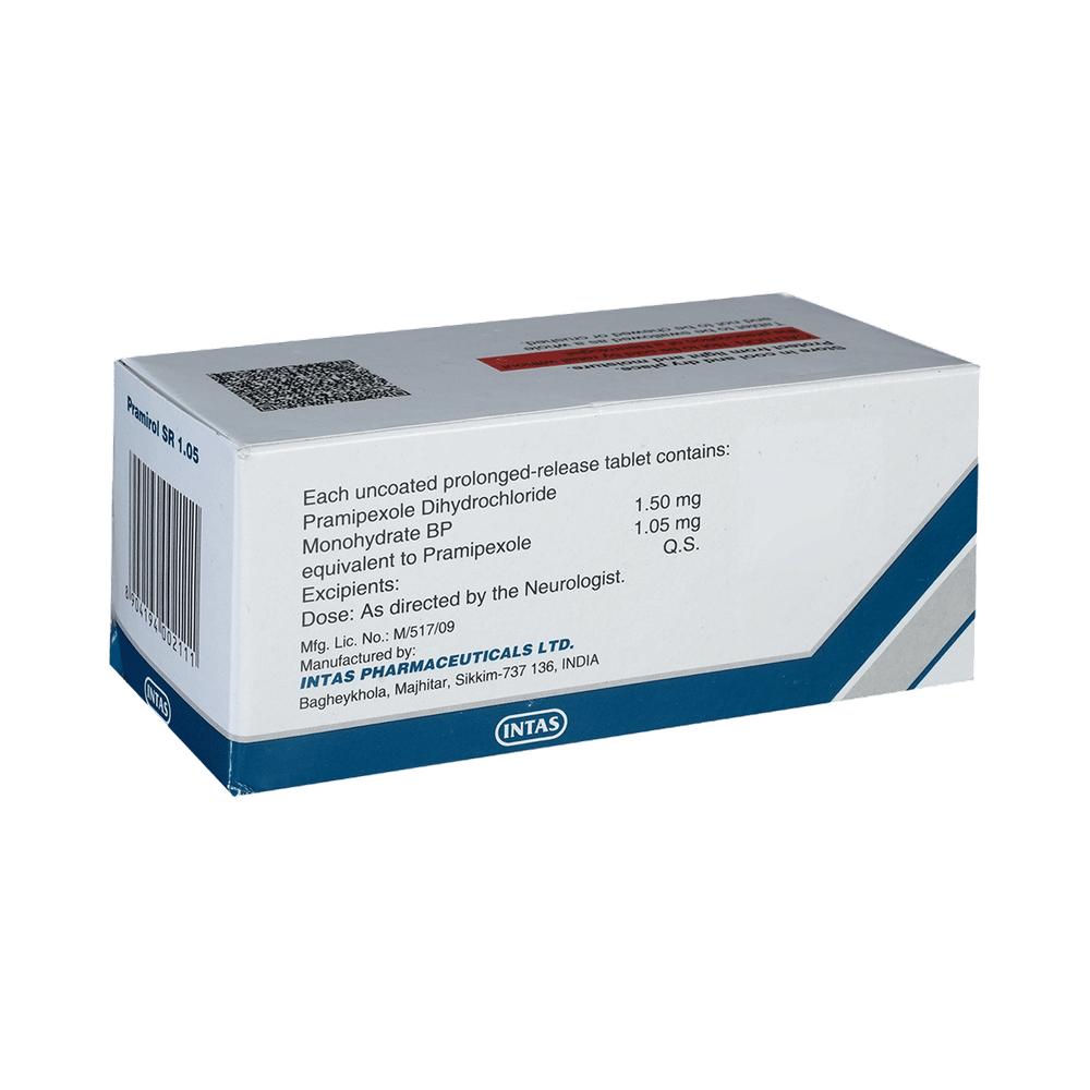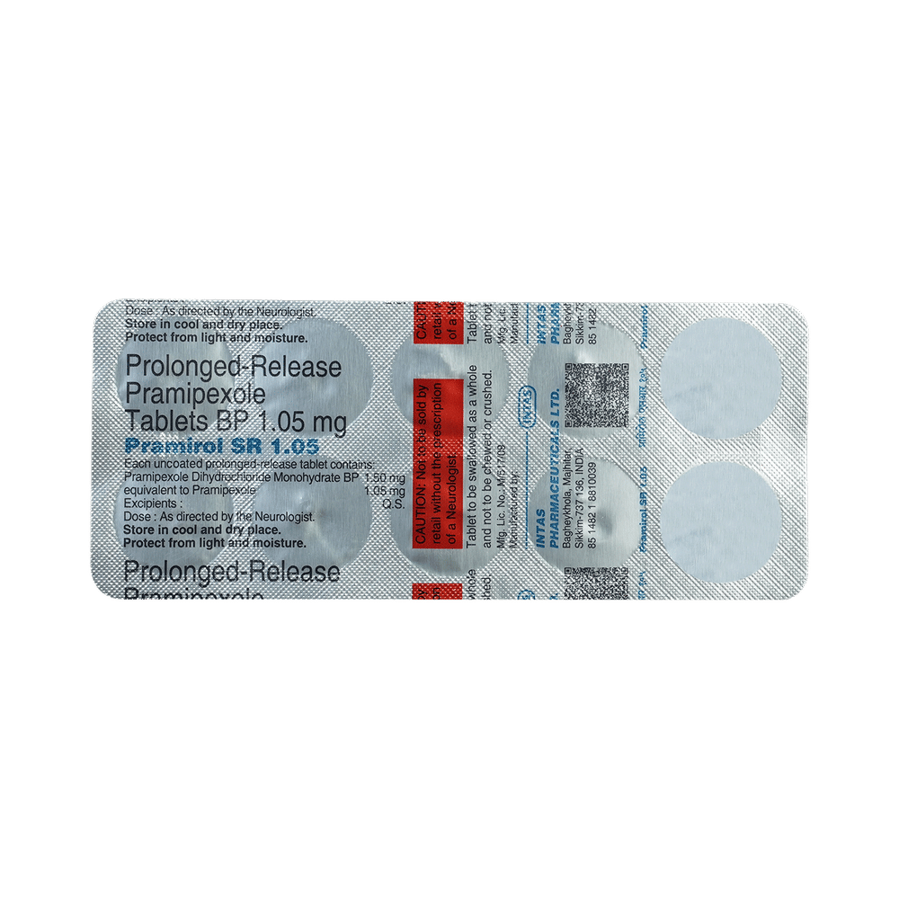 Pramirol SR 1.05 Tablet is used in the treatment of Parkinson's disease and restless leg syndrome (an urge to move the legs usually accompanied or caused by uncomfortable and unpleasant leg sensations). It helps to treat excessive shaking by slowing down the body movements. Pramirol SR 1.05 Tablet should be taken with food. However, take it at the same time each day as this helps to maintain a consistent level of medicine in the body. Take this medicine in the dose and duration as advised by your doctor and if you have missed a dose, take it as soon as you remember it. You should never skip any doses and finish the full course of treatment even if you feel better. This medication must not be stopped suddenly without talking to your doctor.Some common side effects of this medicine include nausea, dry mouth, fatigue, hallucinations, constipation, and peripheral edema. It also causes dizziness and sleepiness, so do not drive or do anything that requires mental focus until you know how this medicine affects you. Inform your doctor if you develop any unusual changes in mood, an abnormally high sex drive, an urge to gamble, or uncontrolled spending as these may prove very harmful.
