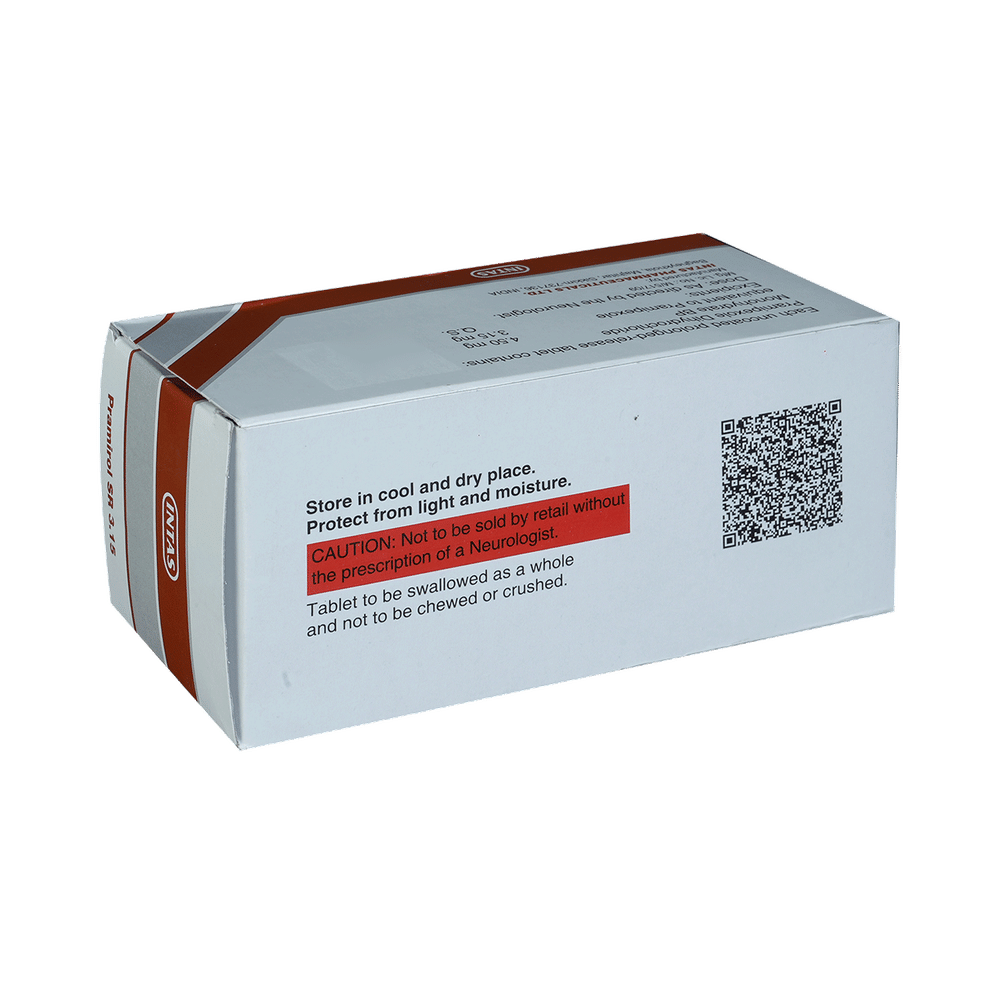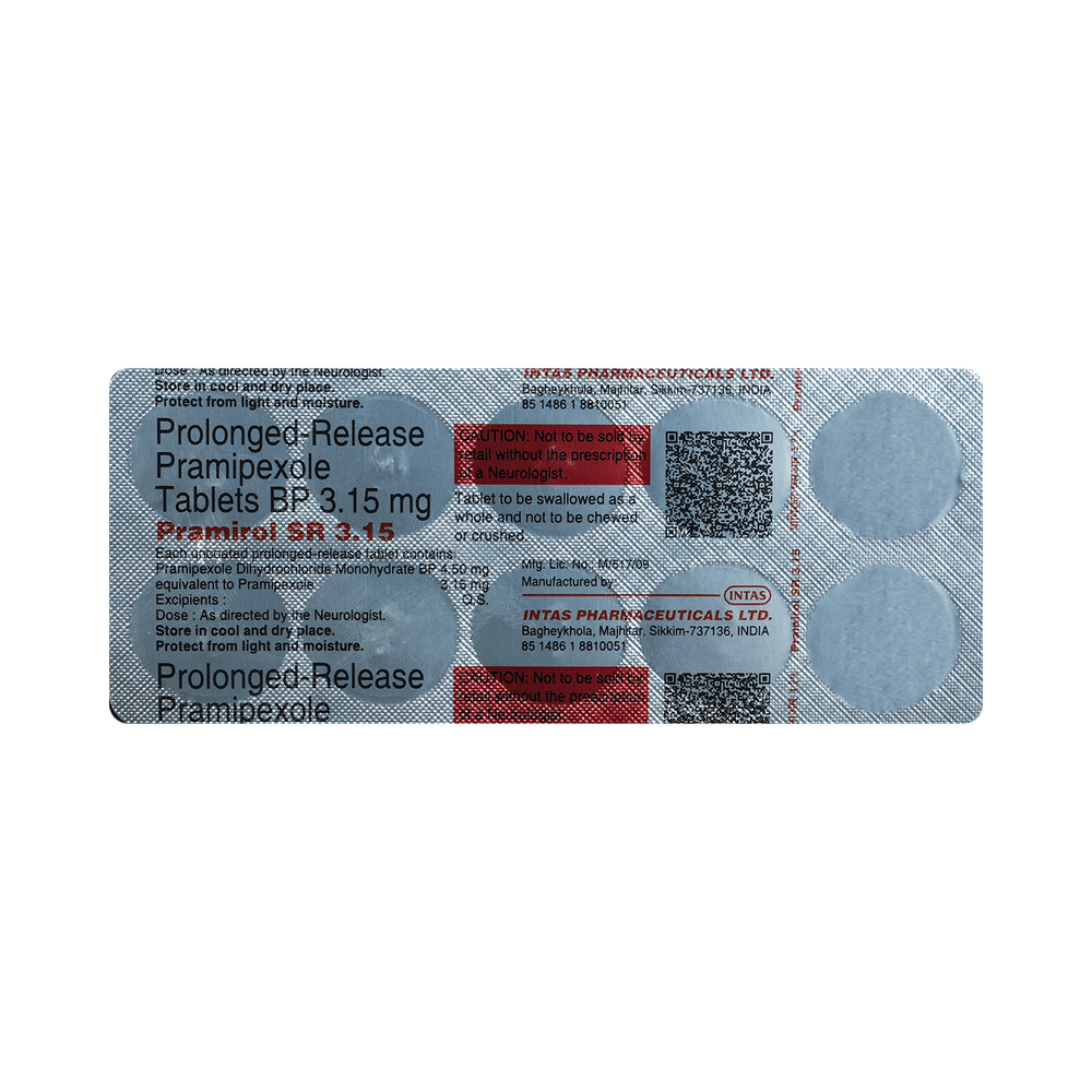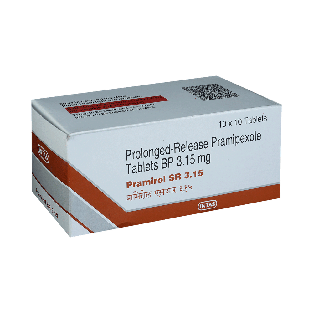 Pramirol SR 3.15 Tablet is used in the treatment of Parkinson's disease and restless leg syndrome (an urge to move the legs usually accompanied or caused by uncomfortable and unpleasant leg sensations). It helps to treat excessive shaking by slowing down the body movements. Pramirol SR 3.15 Tablet should be taken with food. However, take it at the same time each day as this helps to maintain a consistent level of medicine in the body. Take this medicine in the dose and duration as advised by your doctor and if you have missed a dose, take it as soon as you remember it. You should never skip any doses and finish the full course of treatment even if you feel better. This medication must not be stopped suddenly without talking to your doctor.Some common side effects of this medicine include nausea, dry mouth, fatigue, hallucinations, constipation, and peripheral edema. It also causes dizziness and sleepiness, so do not drive or do anything that requires mental focus until you know how this medicine affects you. Inform your doctor if you develop any unusual changes in mood, an abnormally high sex drive, an urge to gamble, or uncontrolled spending as these may prove very harmful.