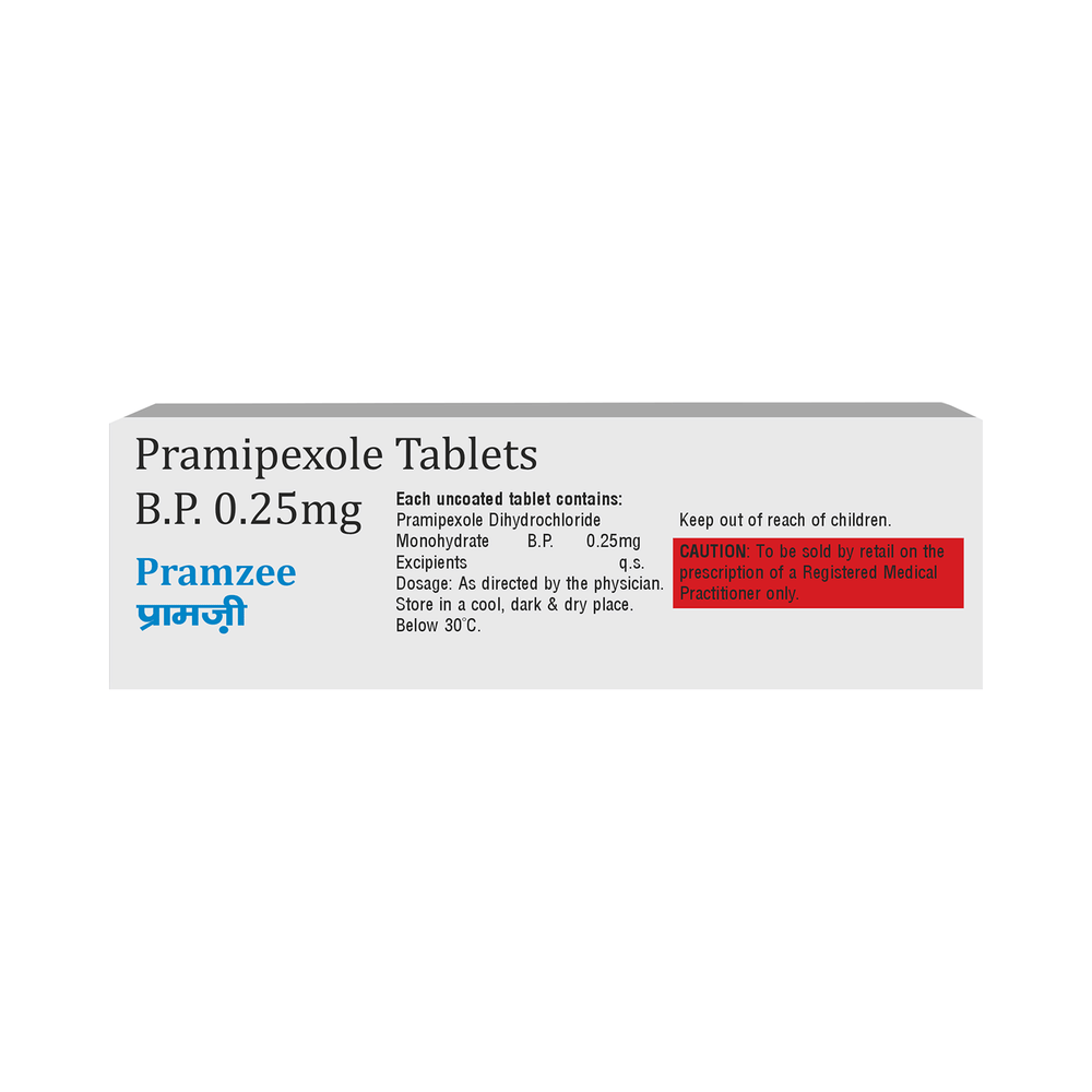 Pramzee Tablet is used in the treatment of Parkinson's disease and restless leg syndrome (an urge to move the legs usually accompanied or caused by uncomfortable and unpleasant leg sensations). It helps to treat excessive shaking by slowing down the body movements. Pramzee Tablet should be taken with food. However, take it at the same time each day as this helps to maintain a consistent level of medicine in the body. Take this medicine in the dose and duration as advised by your doctor and if you have missed a dose, take it as soon as you remember it. You should never skip any doses and finish the full course of treatment even if you feel better. This medication must not be stopped suddenly without talking to your doctor.Some common side effects of this medicine include nausea, dry mouth, fatigue, hallucinations, constipation, and peripheral edema. It also causes dizziness and sleepiness, so do not drive or do anything that requires mental focus until you know how this medicine affects you. Inform your doctor if you develop any unusual changes in mood, an abnormally high sex drive, an urge to gamble, or uncontrolled spending as these may prove very harmful.