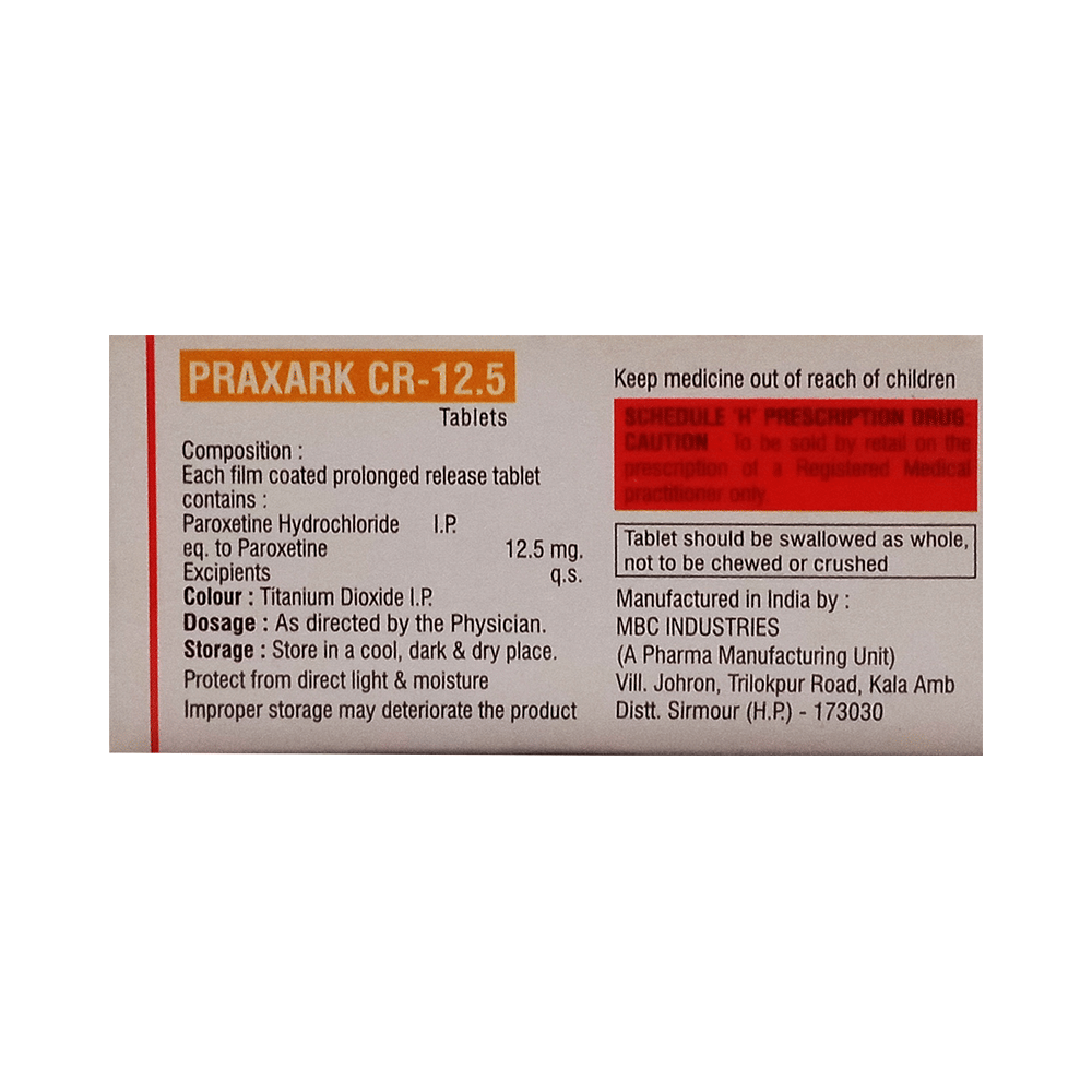 Praxark CR 12.5 Tablet is a type of antidepressant belonging to the selective serotonin reuptake inhibitor (SSRI) group of medicines. It is widely prescribed to treat depression and anxiety-related conditions like obsessive-compulsive disorder, and panic disorder. Praxark CR 12.5 Tablet helps many people to recover from depression by improving their mood and relieving anxiety and tension. It can be taken with or without food. The dose and how often you need it will be decided by your doctor so that you get the right amount to control your symptoms.Your doctor may start you on a lower dose and increase it gradually. Do not change the dose or stop taking it without talking to your doctor, even if you feel well. Doing so may make your condition worse or you may suffer from unpleasant withdrawal symptoms (anxiety, restlessness, palpitations, dizziness, sleep disturbances, etc).To get the most benefit, take this medicine regularly at the same time each day. Your doctor may advise you to take it in the morning if you have trouble sleeping. It may take a few weeks before you start feeling better. Let your doctor know if you do not see any improvement even after 4 weeks.Some common side effects of Praxark CR 12.5 Tablet include nausea, fatigue, dry mouth, loss of appetite, increased sweating, dizziness, nervousness, tremors, insomnia (difficulty in sleeping), and constipation. Sexual side effects like decreased sexual drive, delayed ejaculation, and erectile dysfunction may also be seen. Let your doctor know straight away if you develop any sudden worsening of mood or any thoughts about harming yourself.Before taking this medicine, you should tell your doctor if you have epilepsy (seizure disorder or fits), diabetes, liver or kidney disease, heart problems, or glaucoma. These may affect your treatment. Pregnant or breastfeeding women should also consult their doctor before taking it. Some other medicines may affect the way it works, especially other antidepressants and medicines called MAO inhibitors. Please tell your doctor about all the medicines you are taking to make sure you are safe.