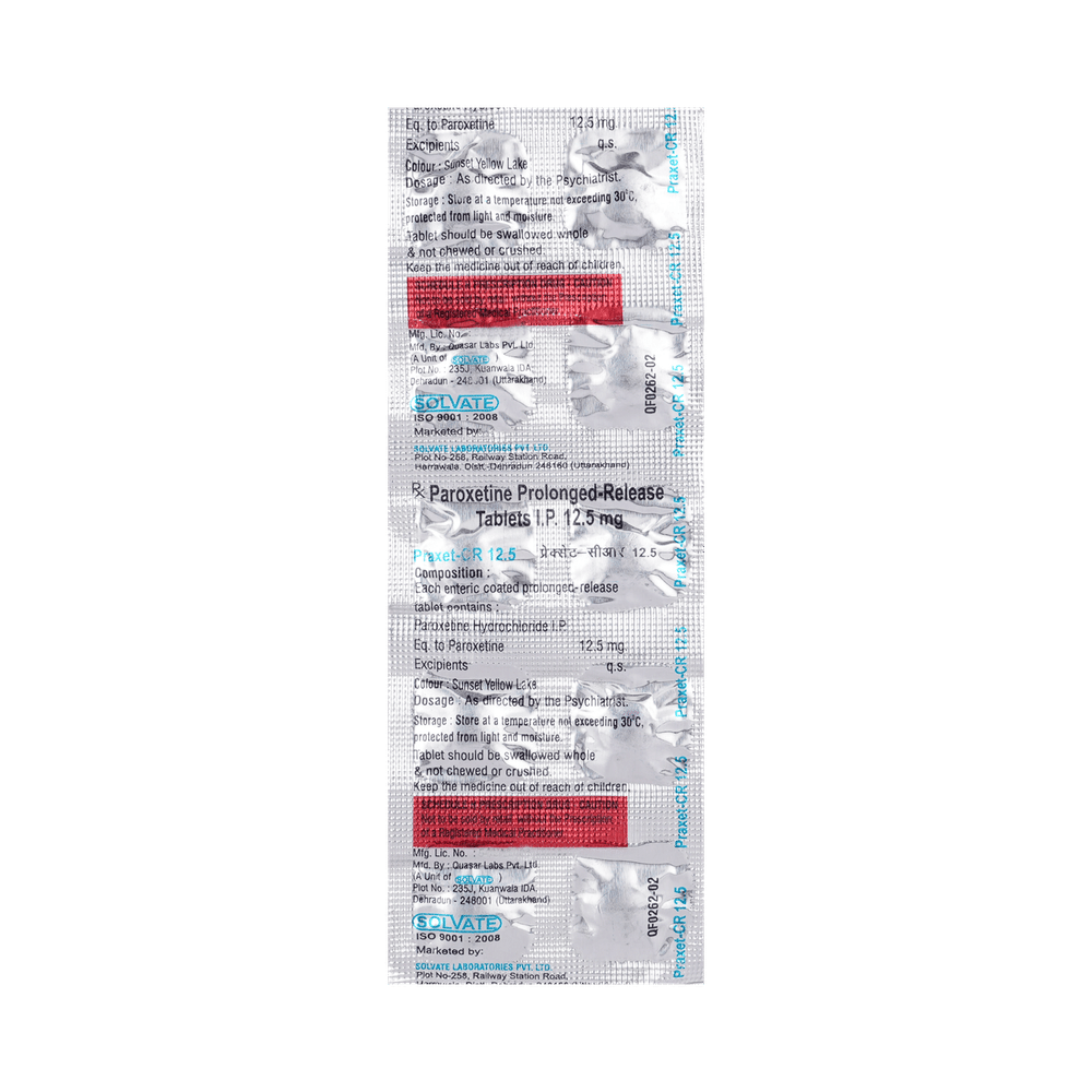 Praxet 12.5mg Tablet CR is a type of antidepressant belonging to the selective serotonin reuptake inhibitor (SSRI) group of medicines. It is widely prescribed to treat depression and anxiety-related conditions like obsessive-compulsive disorder, and panic disorder. Praxet 12.5mg Tablet CR helps many people to recover from depression by improving their mood and relieving anxiety and tension. It can be taken with or without food. The dose and how often you need it will be decided by your doctor so that you get the right amount to control your symptoms.Your doctor may start you on a lower dose and increase it gradually. Do not change the dose or stop taking it without talking to your doctor, even if you feel well. Doing so may make your condition worse or you may suffer from unpleasant withdrawal symptoms (anxiety, restlessness, palpitations, dizziness, sleep disturbances, etc).To get the most benefit, take this medicine regularly at the same time each day. Your doctor may advise you to take it in the morning if you have trouble sleeping. It may take a few weeks before you start feeling better. Let your doctor know if you do not see any improvement even after 4 weeks.Some common side effects of Praxet 12.5mg Tablet CR include nausea, fatigue, dry mouth, loss of appetite, increased sweating, dizziness, nervousness, tremors, insomnia (difficulty in sleeping), and constipation. Sexual side effects like decreased sexual drive, delayed ejaculation, and erectile dysfunction may also be seen. Let your doctor know straight away if you develop any sudden worsening of mood or any thoughts about harming yourself.Before taking this medicine, you should tell your doctor if you have epilepsy (seizure disorder or fits), diabetes, liver or kidney disease, heart problems, or glaucoma. These may affect your treatment. Pregnant or breastfeeding women should also consult their doctor before taking it. Some other medicines may affect the way it works, especially other antidepressants and medicines called MAO inhibitors. Please tell your doctor about all the medicines you are taking to make sure you are safe.