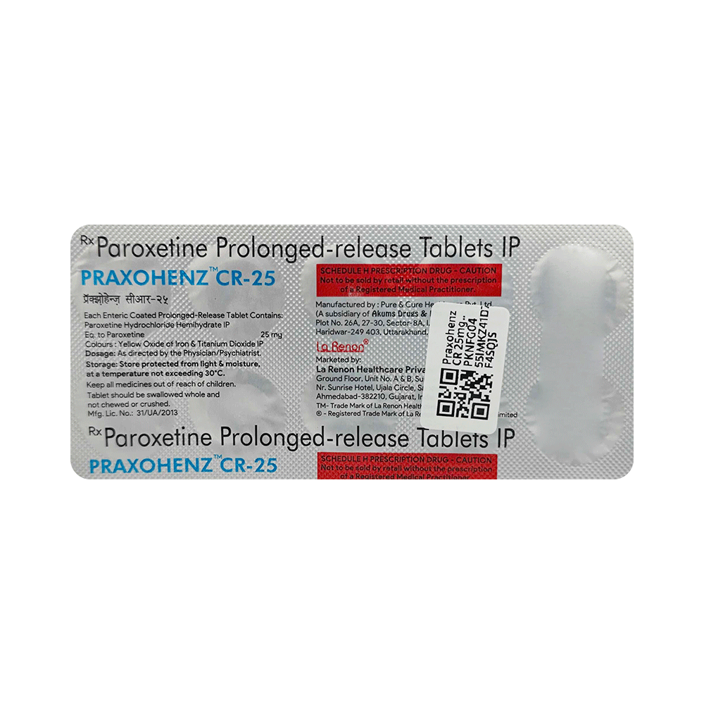 Praxohenz CR 25mg Tablet is a type of antidepressant belonging to the selective serotonin reuptake inhibitor (SSRI) group of medicines. It is widely prescribed to treat depression and anxiety-related conditions like obsessive-compulsive disorder, and panic disorder. Praxohenz CR 25mg Tablet helps many people to recover from depression by improving their mood and relieving anxiety and tension. It can be taken with or without food. The dose and how often you need it will be decided by your doctor so that you get the right amount to control your symptoms.Your doctor may start you on a lower dose and increase it gradually. Do not change the dose or stop taking it without talking to your doctor, even if you feel well. Doing so may make your condition worse or you may suffer from unpleasant withdrawal symptoms (anxiety, restlessness, palpitations, dizziness, sleep disturbances, etc).To get the most benefit, take this medicine regularly at the same time each day. Your doctor may advise you to take it in the morning if you have trouble sleeping. It may take a few weeks before you start feeling better. Let your doctor know if you do not see any improvement even after 4 weeks.Some common side effects of Praxohenz CR 25mg Tablet include nausea, fatigue, dry mouth, loss of appetite, increased sweating, dizziness, nervousness, tremors, insomnia (difficulty in sleeping), and constipation. Sexual side effects like decreased sexual drive, delayed ejaculation, and erectile dysfunction may also be seen. Let your doctor know straight away if you develop any sudden worsening of mood or any thoughts about harming yourself.Before taking this medicine, you should tell your doctor if you have epilepsy (seizure disorder or fits), diabetes, liver or kidney disease, heart problems, or glaucoma. These may affect your treatment. Pregnant or breastfeeding women should also consult their doctor before taking it. Some other medicines may affect the way it works, especially other antidepressants and medicines called MAO inhibitors. Please tell your doctor about all the medicines you are taking to make sure you are safe.