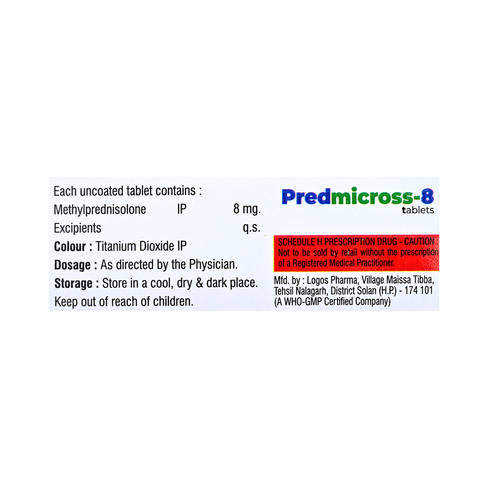 Predmicross 8 Tablet is a medicine used to treat a wide variety of medical conditions such as severe allergic conditions, asthma, rheumatic disorder, skin and eye disorders, and systemic lupus erythematosus. It provides relief by preventing the release of substances that cause inflammation. Predmicross 8 Tablet should be taken with food. This will prevent you from getting an upset stomach. The dose and duration will depend on what you are being treated for. You should always take the amount prescribed. Do not take a larger dose or use it more often. Keep taking it regularly even if you feel well. Some conditions will become worse if you stop using this medicine.The most common side effects of this medicine include skin thinning, increased risk of infection, reduction in bone density, and mood changes. If these side effects bother you or do not go away, your doctor may suggest ways of preventing or reducing them. The use of this medicine may lower your ability to fight infections so avoid being near people who might pass on infections such as measles, chickenpox, or flu.Before using this medicine, you should tell your doctor if you have brittle bones (osteoporosis), mood disorders, high blood pressure, or liver disease. Also, tell your doctor if you have diabetes, this medicine may increase blood glucose levels which can cause or worsen diabetes. Many other drugs may affect, or be affected by, this medicine so let your doctor know all other medicines you are using, to make sure it is safe. You should also tell your doctor if you are pregnant, planning pregnancy or breastfeeding.