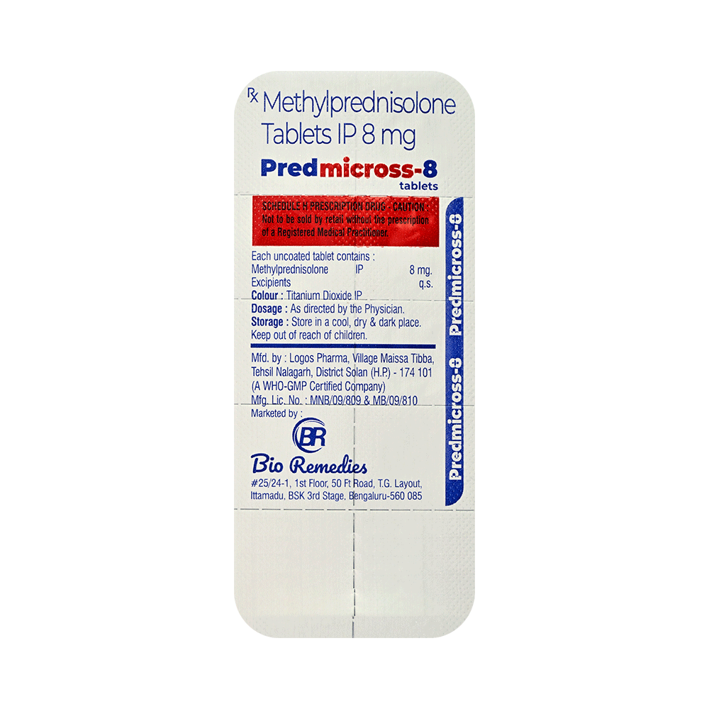 In Treatment of Allergic conditionsPredmicross 8 Tablet is used to treat different inflammatory and allergic conditions including arthritis, lupus, psoriasis, ulcerative colitis which affect the skin, blood, eyes, lungs, stomach, and nervous system. It works by lowering your immune system’s response to these conditions thereby reducing symptoms such as swelling, pain, itching and other allergic-type reactions.This medicine is given orally (by mouth). You should always take it as it has been prescribed for you. Do not stop taking it without your doctor’s advice. This can cause unpleasant withdrawal symptoms. Because this medicine weakens your immune system, you should avoid being near people who are ill or have infections.In Treatment of Systemic lupus erythematosus (SLE)Systemic lupus erythematosus (SLE) is an autoimmune disease. In this disease, the immune system of the body mistakenly attacks healthy tissue. It can affect the skin, joints, kidneys, brain, and other organs. Predmicross 8 Tablet prevents the release of substances in the body that cause inflammation. It lowers your immune system’s response and reduces symptoms such as swelling, pain, itching and other allergic-type reactions.In Treatment of Skin disordersPredmicross 8 Tablet prevents the release of substances in the body that cause inflammation. It can be used to treat different inflammatory and allergic conditions of the skin such as eczema and psoriasis. It works by lowering your immune system’s response to these conditions thereby relieving symptoms such as swelling, pain, itching and other allergic-type reactions.In Treatment of Eye disordersPredmicross 8 Tablet helps relieve symptoms of eye infections such as redness, swelling, itching and watering of eyes. This medicine works by decreasing the production of certain chemicals that cause inflammation of the eyes. This will make it easier for you to go about your daily activities. Use it as prescribed to get the most benefit. If you see no improvement even after a week, talk to your doctor.In Treatment of Rheumatic disorderRheumatic disorder is an autoimmune condition where your body’s immune system (which usually fights bacteria and viruses) attacks your body’s own cells. Predmicross 8 Tablet stops that from happening and can relieve the symptoms of this condition such as pain, swelling, and stiffness in your joints. It can also slow down joint damage, reduce disability, and enable you to be as active for as long as possible. It can take several weeks or months to notice the effect of the medicine. You should continue taking it until your doctor says it is okay to stop using the medicine.show moreshow less