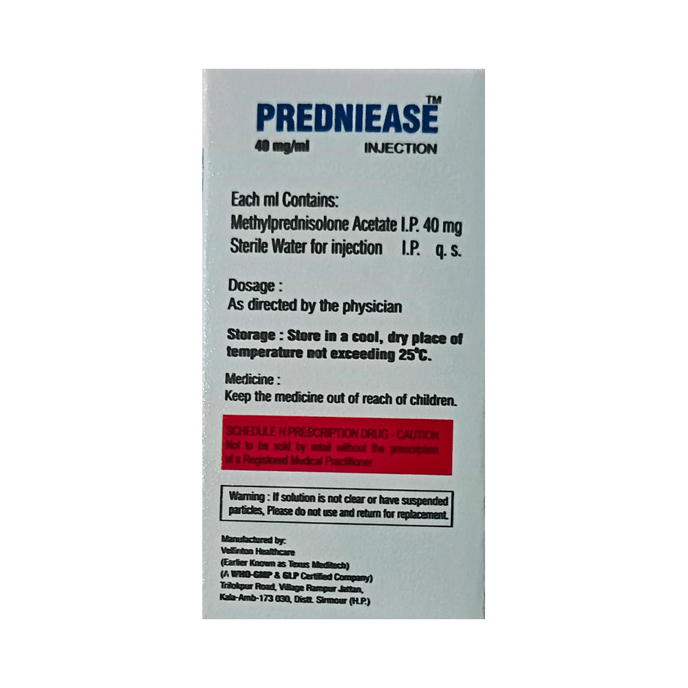 In Treatment of Allergic conditionsPredniease Injection is used to treat different inflammatory and allergic conditions including arthritis, lupus, psoriasis, ulcerative colitis which affect the skin, blood, eyes, lungs, stomach, and nervous system. It works by lowering your immune system’s response to these conditions thereby reducing symptoms such as swelling, pain, itching and other allergic-type reactions.This medicine is given orally (by mouth). You should always take it as it has been prescribed for you. Do not stop taking it without your doctor’s advice. This can cause unpleasant withdrawal symptoms. Because this medicine weakens your immune system, you should avoid being near people who are ill or have infections.In Treatment of Systemic lupus erythematosus (SLE)Systemic lupus erythematosus (SLE) is an autoimmune disease. In this disease, the immune system of the body mistakenly attacks healthy tissue. It can affect the skin, joints, kidneys, brain, and other organs. Predniease Injection prevents the release of substances in the body that cause inflammation. It lowers your immune system’s response and reduces symptoms such as swelling, pain, itching and other allergic-type reactions.In Treatment of Skin disordersPredniease Injection prevents the release of substances in the body that cause inflammation. It can be used to treat different inflammatory and allergic conditions of the skin such as eczema and psoriasis. It works by lowering your immune system’s response to these conditions thereby relieving symptoms such as swelling, pain, itching and other allergic-type reactions.In Treatment of Eye disordersPredniease Injection helps relieve symptoms of eye infections such as redness, swelling, itching and watering of eyes. This medicine works by decreasing the production of certain chemicals that cause inflammation of the eyes. This will make it easier for you to go about your daily activities. Use it as prescribed to get the most benefit. If you see no improvement even after a week, talk to your doctor.In Treatment of Rheumatic disorderRheumatic disorder is an autoimmune condition where your body’s immune system (which usually fights bacteria and viruses) attacks your body’s own cells. Predniease Injection stops that from happening and can relieve the symptoms of this condition such as pain, swelling, and stiffness in your joints. It can also slow down joint damage, reduce disability, and enable you to be as active for as long as possible. It can take several weeks or months to notice the effect of the medicine. You should continue taking it until your doctor says it is okay to stop using the medicine.show moreshow less