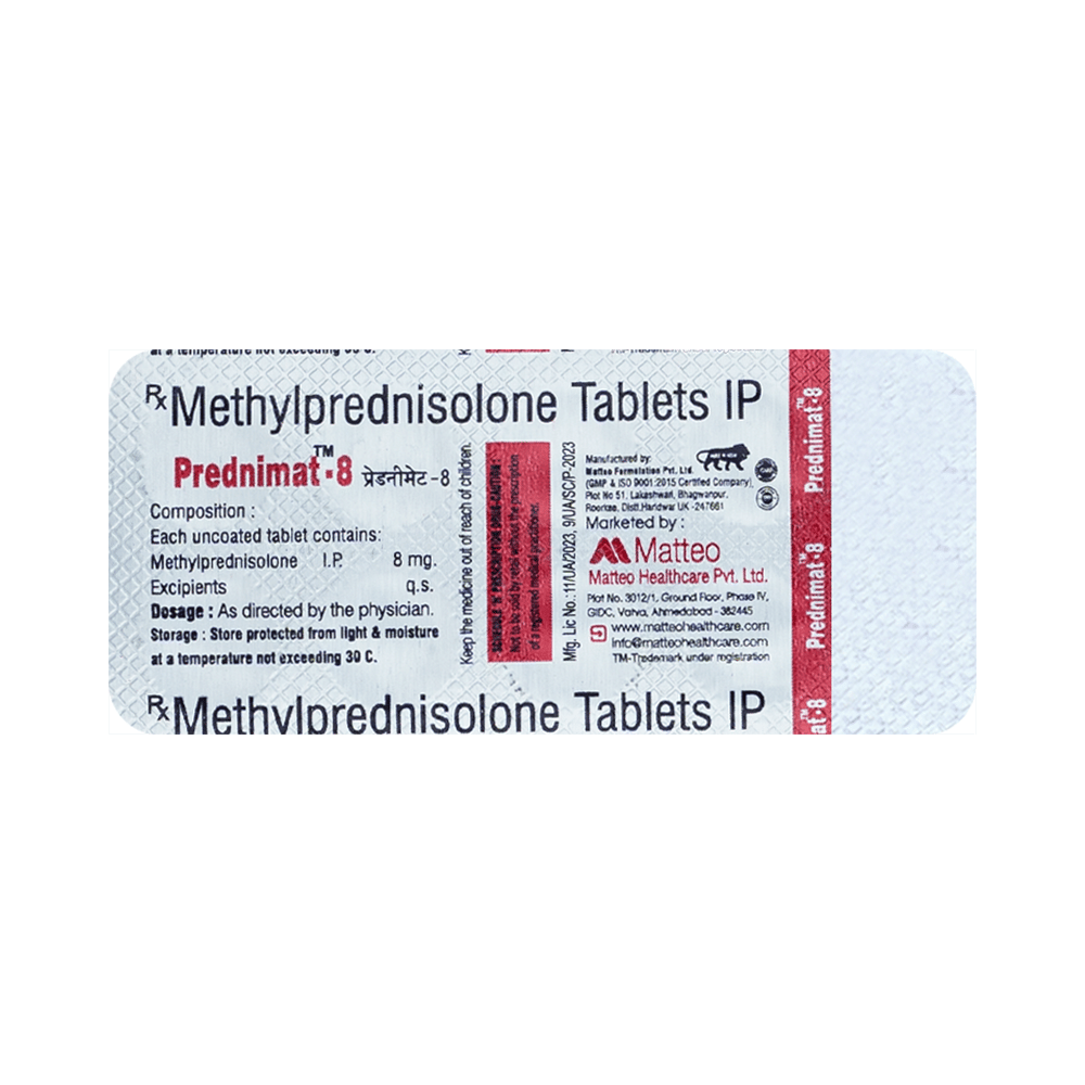In Treatment of Allergic conditionsPrednimat 8 Tablet is used to treat different inflammatory and allergic conditions including arthritis, lupus, psoriasis, ulcerative colitis which affect the skin, blood, eyes, lungs, stomach, and nervous system. It works by lowering your immune system’s response to these conditions thereby reducing symptoms such as swelling, pain, itching and other allergic-type reactions.This medicine is given orally (by mouth). You should always take it as it has been prescribed for you. Do not stop taking it without your doctor’s advice. This can cause unpleasant withdrawal symptoms. Because this medicine weakens your immune system, you should avoid being near people who are ill or have infections.In Treatment of Systemic lupus erythematosus (SLE)Systemic lupus erythematosus (SLE) is an autoimmune disease. In this disease, the immune system of the body mistakenly attacks healthy tissue. It can affect the skin, joints, kidneys, brain, and other organs. Prednimat 8 Tablet prevents the release of substances in the body that cause inflammation. It lowers your immune system’s response and reduces symptoms such as swelling, pain, itching and other allergic-type reactions.In Treatment of Skin disordersPrednimat 8 Tablet prevents the release of substances in the body that cause inflammation. It can be used to treat different inflammatory and allergic conditions of the skin such as eczema and psoriasis. It works by lowering your immune system’s response to these conditions thereby relieving symptoms such as swelling, pain, itching and other allergic-type reactions.In Treatment of Eye disordersPrednimat 8 Tablet helps relieve symptoms of eye infections such as redness, swelling, itching and watering of eyes. This medicine works by decreasing the production of certain chemicals that cause inflammation of the eyes. This will make it easier for you to go about your daily activities. Use it as prescribed to get the most benefit. If you see no improvement even after a week, talk to your doctor.In Treatment of Rheumatic disorderRheumatic disorder is an autoimmune condition where your body’s immune system (which usually fights bacteria and viruses) attacks your body’s own cells. Prednimat 8 Tablet stops that from happening and can relieve the symptoms of this condition such as pain, swelling, and stiffness in your joints. It can also slow down joint damage, reduce disability, and enable you to be as active for as long as possible. It can take several weeks or months to notice the effect of the medicine. You should continue taking it until your doctor says it is okay to stop using the medicine.show moreshow less