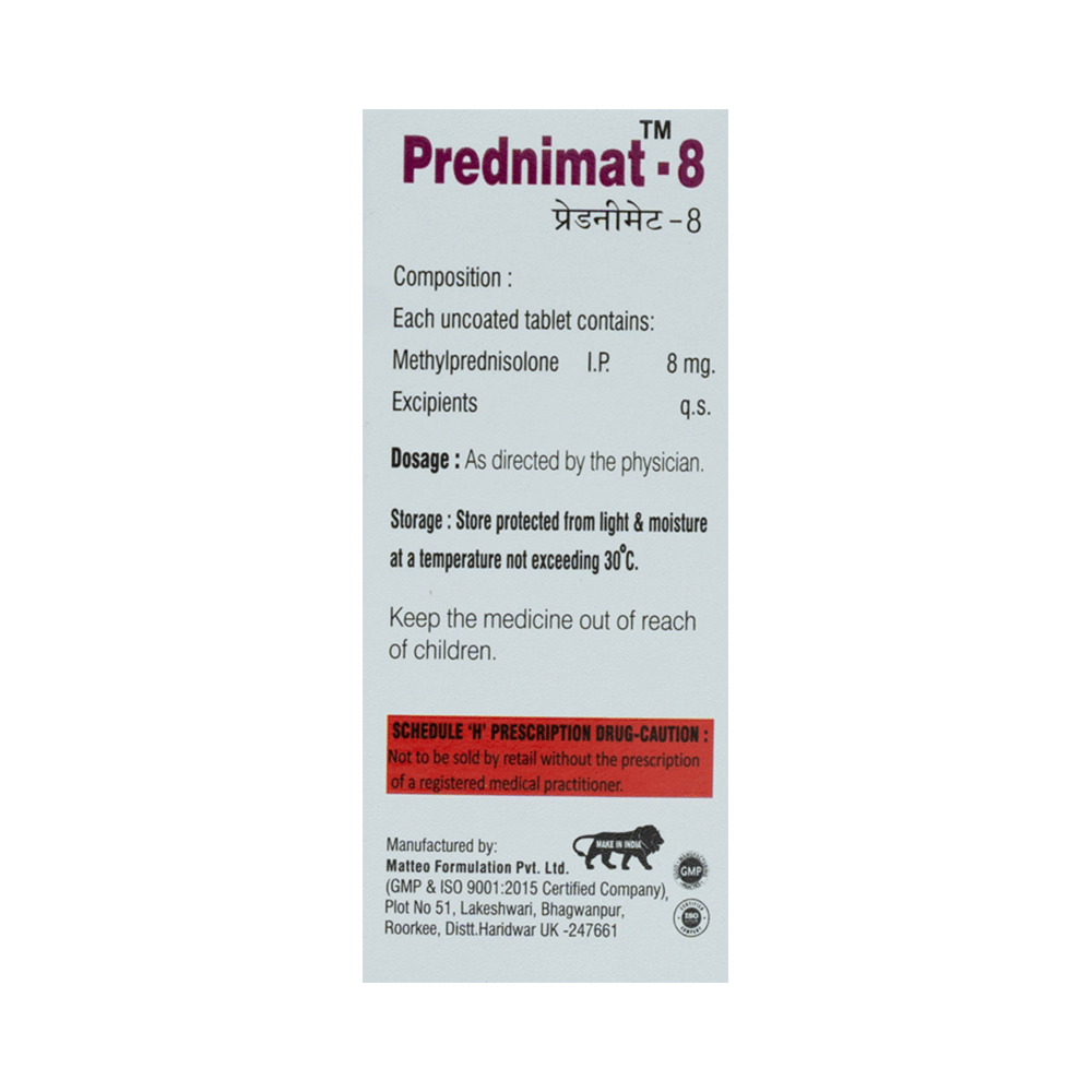 Prednimat 8 Tablet is a medicine used to treat a wide variety of medical conditions such as severe allergic conditions, asthma, rheumatic disorder, skin and eye disorders, and systemic lupus erythematosus. It provides relief by preventing the release of substances that cause inflammation. Prednimat 8 Tablet should be taken with food. This will prevent you from getting an upset stomach. The dose and duration will depend on what you are being treated for. You should always take the amount prescribed. Do not take a larger dose or use it more often. Keep taking it regularly even if you feel well. Some conditions will become worse if you stop using this medicine.The most common side effects of this medicine include skin thinning, increased risk of infection, reduction in bone density, and mood changes. If these side effects bother you or do not go away, your doctor may suggest ways of preventing or reducing them. The use of this medicine may lower your ability to fight infections so avoid being near people who might pass on infections such as measles, chickenpox, or flu.Before using this medicine, you should tell your doctor if you have brittle bones (osteoporosis), mood disorders, high blood pressure, or liver disease. Also, tell your doctor if you have diabetes, this medicine may increase blood glucose levels which can cause or worsen diabetes. Many other drugs may affect, or be affected by, this medicine so let your doctor know all other medicines you are using, to make sure it is safe. You should also tell your doctor if you are pregnant, planning pregnancy or breastfeeding.
