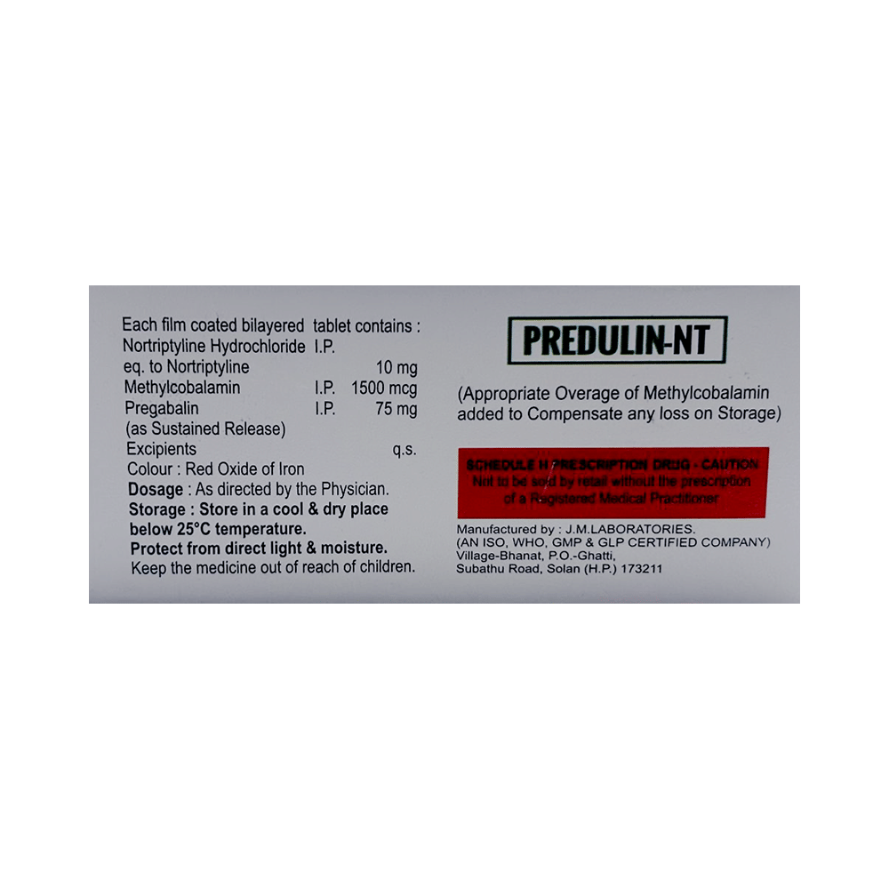 Predulin-NT Tablet SR is a combination of three medicines: Pregabalin, Nortriptyline and Methylcobalamin. Pregabalin is an alpha 2 delta ligand which decreases pain by modulating calcium channel activity of the nerve cells. Nortriptyline is a tricyclic antidepressant which increases the levels of chemical messengers (serotonin and noradrenaline) that stop the movement of pain signals in the brain. Methylcobalamin is a form of vitamin B which helps in the production of myelin, a substance that protects nerve fibers and rejuvenates damaged nerve cells. Together, they relieve neuropathic pain (pain from damaged nerves).