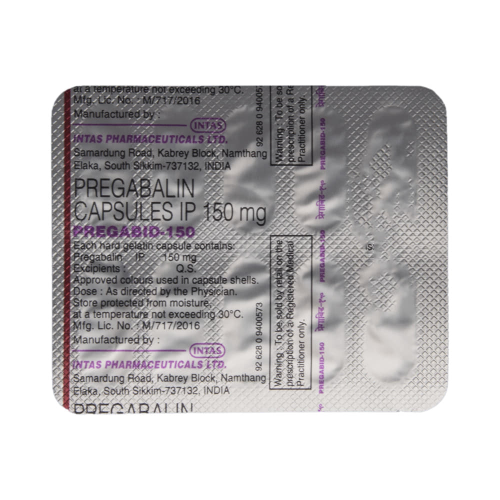 pregabID 150 Capsule is a medicine used to relieve pain caused by nerve damage (neuropathic pain) due to diabetes, shingles (herpes zoster infection), spinal cord injury, or other conditions. It is also used to treat widespread muscle pain and stiffness in people with fibromyalgia. pregabID 150 Capsule belongs to the anti-epileptic group of medicines and can also be used to treat certain types of seizures (fits) in combination with other medicines. Additionally, it may also be prescribed to treat the symptoms of anxiety disorder if other medicines are not suitable.You can take pregabID 150 Capsule with or without food, but it is important to take this medicine at the same time each day to get the most benefit. The exact dose and duration of treatment will depend on your condition and how you respond to it. Your doctor will probably start this medicine at a low dose and increase it gradually. It may take a few weeks for the medicine to work properly. Follow your doctor’s instructions and continue taking it regularly until your doctor advises you to stop. Do not miss any dose, otherwise, your condition may worsen.The side effects of this medicine are usually mild and go away by themselves. The most common ones are feeling sleepy or dizzy, dryness in the mouth, blurred vision, weight gain, edema (swelling over the whole body), and difficulty in concentrating. Most side effects are not serious and do not need medical attention. Talk to your doctor about potential side effects and ways in which you might prevent or cope with them.Before taking the medicine you should tell your doctor if you are pregnant, breastfeeding, or planning to become pregnant. Be careful while driving as sleepiness, dizziness, and blurring of vision may be seen as side effects. You should avoid drinking alcohol along with this medicine as it may lead to excessive sleepiness and dizziness.