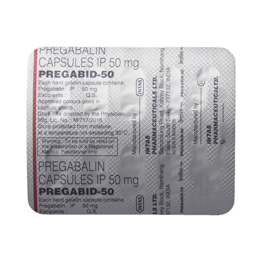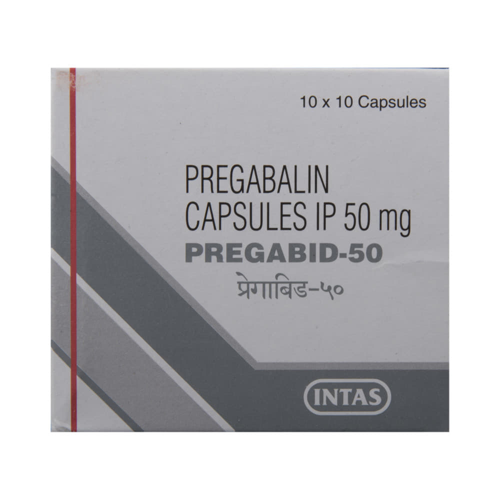 pregabID 50 Capsule is a medicine used to relieve pain caused by nerve damage (neuropathic pain) due to diabetes, shingles (herpes zoster infection), spinal cord injury, or other conditions. It is also used to treat widespread muscle pain and stiffness in people with fibromyalgia. pregabID 50 Capsule belongs to the anti-epileptic group of medicines and can also be used to treat certain types of seizures (fits) in combination with other medicines. Additionally, it may also be prescribed to treat the symptoms of anxiety disorder if other medicines are not suitable.You can take pregabID 50 Capsule with or without food, but it is important to take this medicine at the same time each day to get the most benefit. The exact dose and duration of treatment will depend on your condition and how you respond to it. Your doctor will probably start this medicine at a low dose and increase it gradually. It may take a few weeks for the medicine to work properly. Follow your doctor’s instructions and continue taking it regularly until your doctor advises you to stop. Do not miss any dose, otherwise, your condition may worsen.The side effects of this medicine are usually mild and go away by themselves. The most common ones are feeling sleepy or dizzy, dryness in the mouth, blurred vision, weight gain, edema (swelling over the whole body), and difficulty in concentrating. Most side effects are not serious and do not need medical attention. Talk to your doctor about potential side effects and ways in which you might prevent or cope with them.Before taking the medicine you should tell your doctor if you are pregnant, breastfeeding, or planning to become pregnant. Be careful while driving as sleepiness, dizziness, and blurring of vision may be seen as side effects. You should avoid drinking alcohol along with this medicine as it may lead to excessive sleepiness and dizziness.