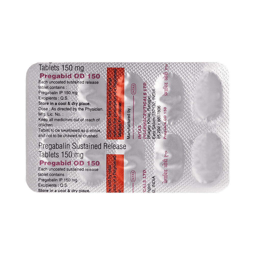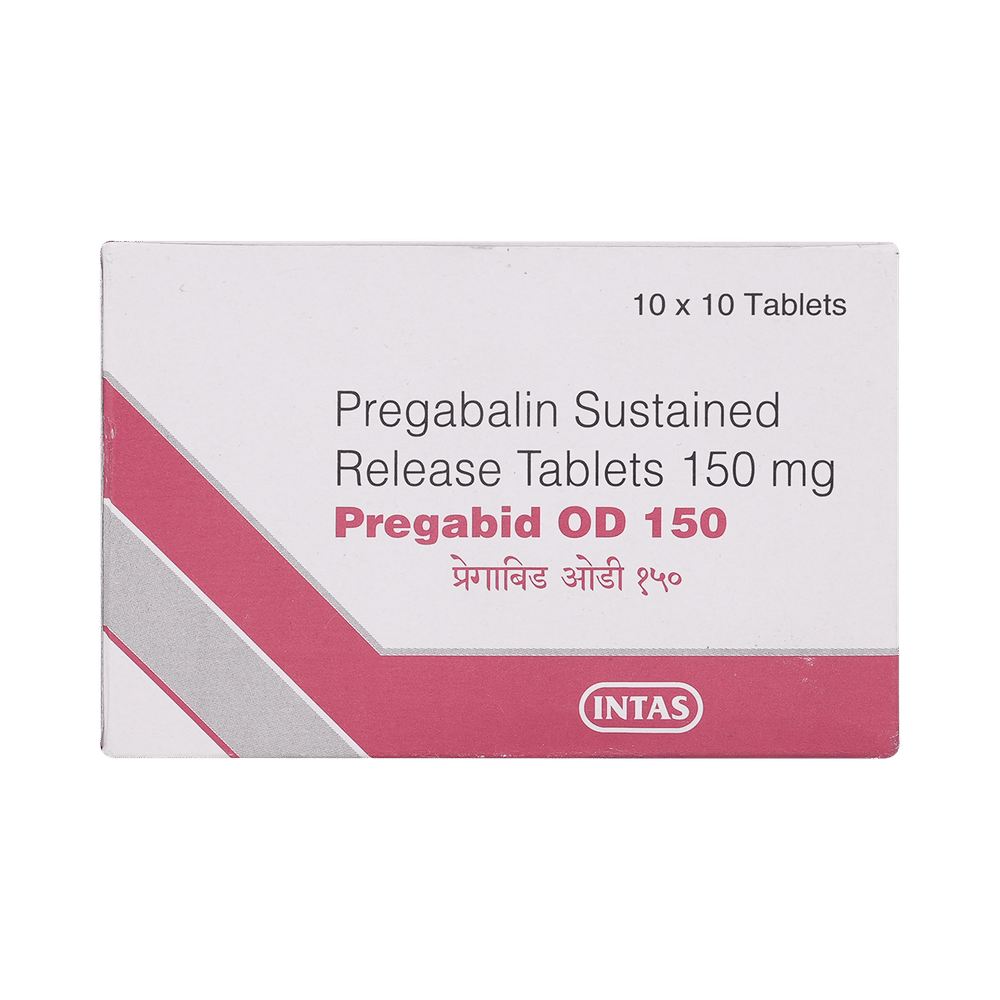 pregabID OD 150 Tablet is a medicine used to relieve pain caused by nerve damage (neuropathic pain) due to diabetes, shingles (herpes zoster infection), spinal cord injury, or other conditions. It is also used to treat widespread muscle pain and stiffness in people with fibromyalgia. pregabID OD 150 Tablet belongs to the anti-epileptic group of medicines and can also be used to treat certain types of seizures (fits) in combination with other medicines. Additionally, it may also be prescribed to treat the symptoms of anxiety disorder if other medicines are not suitable.You can take pregabID OD 150 Tablet with or without food, but it is important to take this medicine at the same time each day to get the most benefit. The exact dose and duration of treatment will depend on your condition and how you respond to it. Your doctor will probably start this medicine at a low dose and increase it gradually. It may take a few weeks for the medicine to work properly. Follow your doctor’s instructions and continue taking it regularly until your doctor advises you to stop. Do not miss any dose, otherwise, your condition may worsen.The side effects of this medicine are usually mild and go away by themselves. The most common ones are feeling sleepy or dizzy, dryness in the mouth, blurred vision, weight gain, edema (swelling over the whole body), and difficulty in concentrating. Most side effects are not serious and do not need medical attention. Talk to your doctor about potential side effects and ways in which you might prevent or cope with them.Before taking the medicine you should tell your doctor if you are pregnant, breastfeeding, or planning to become pregnant. Be careful while driving as sleepiness, dizziness, and blurring of vision may be seen as side effects. You should avoid drinking alcohol along with this medicine as it may lead to excessive sleepiness and dizziness.