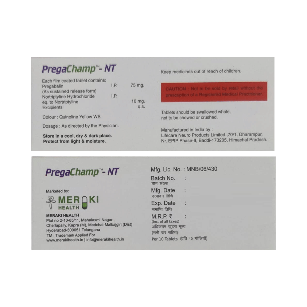 Pregachamp-NT Tablet SR is a combination of two medicines: Pregabalin and Nortriptyline. Pregabalin is an alpha-2 delta ligand that decreases pain by modulating the calcium channel activity of the nerve cells. Nortriptyline is a tricyclic antidepressant that increases the levels of chemical messengers (serotonin and noradrenaline) that stop the movement of pain signals in the brain. Together, they relieve neuropathic pain (pain from damaged nerves).