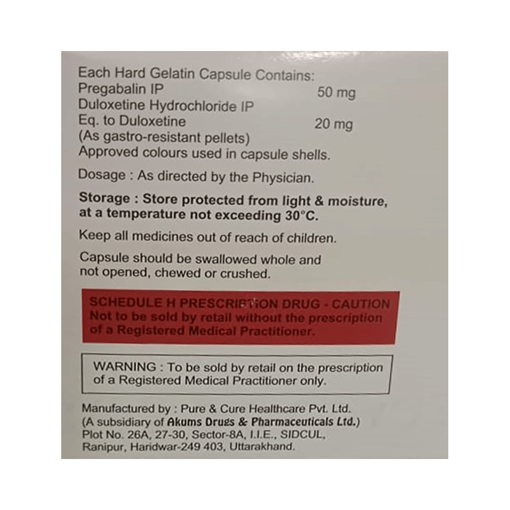 Salt Composition: Pregabalin (50mg) + Duloxetine (20mg)