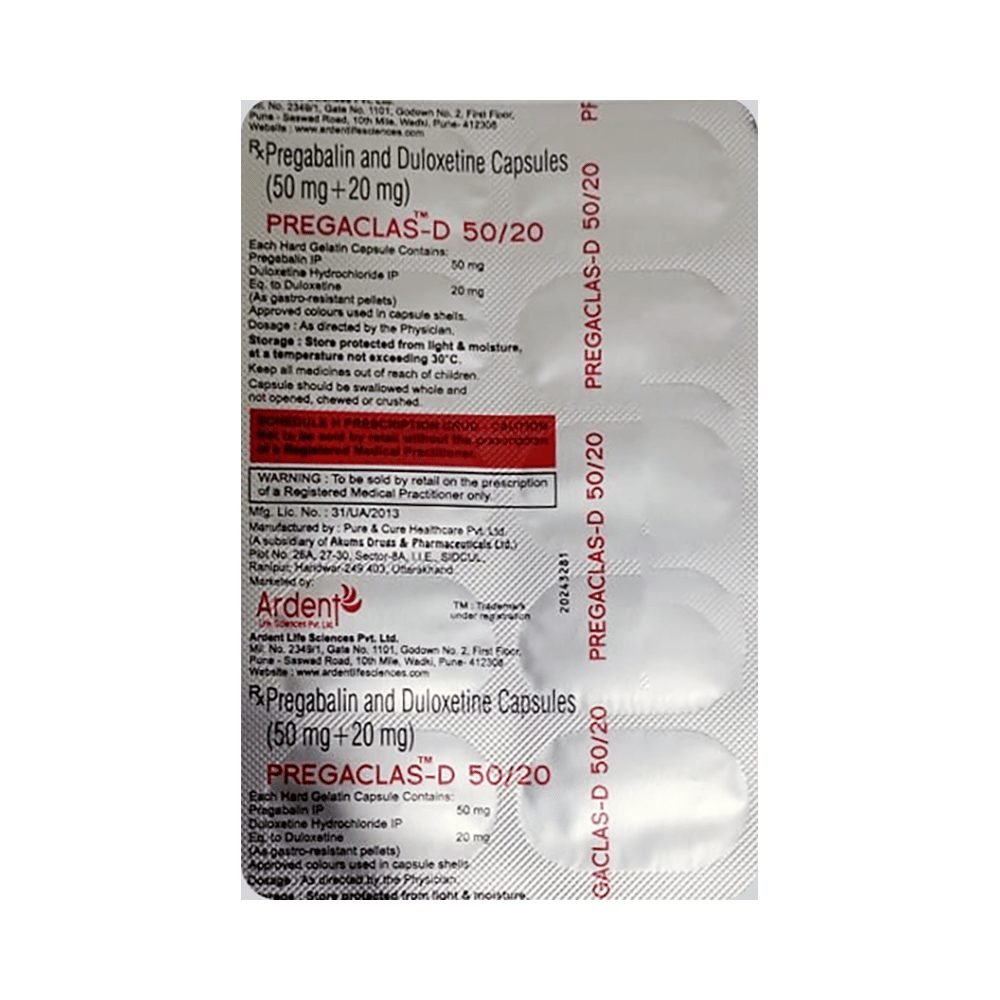 Pregaclas D 50/20 Capsule is a combination of two medicines: pregabalin and duloxetine. Pregabalin decreases neurotransmitter release, while duloxetine boosts serotonin and norepinephrine levels to modulate pain perception, working together to relieve nerve pain.
