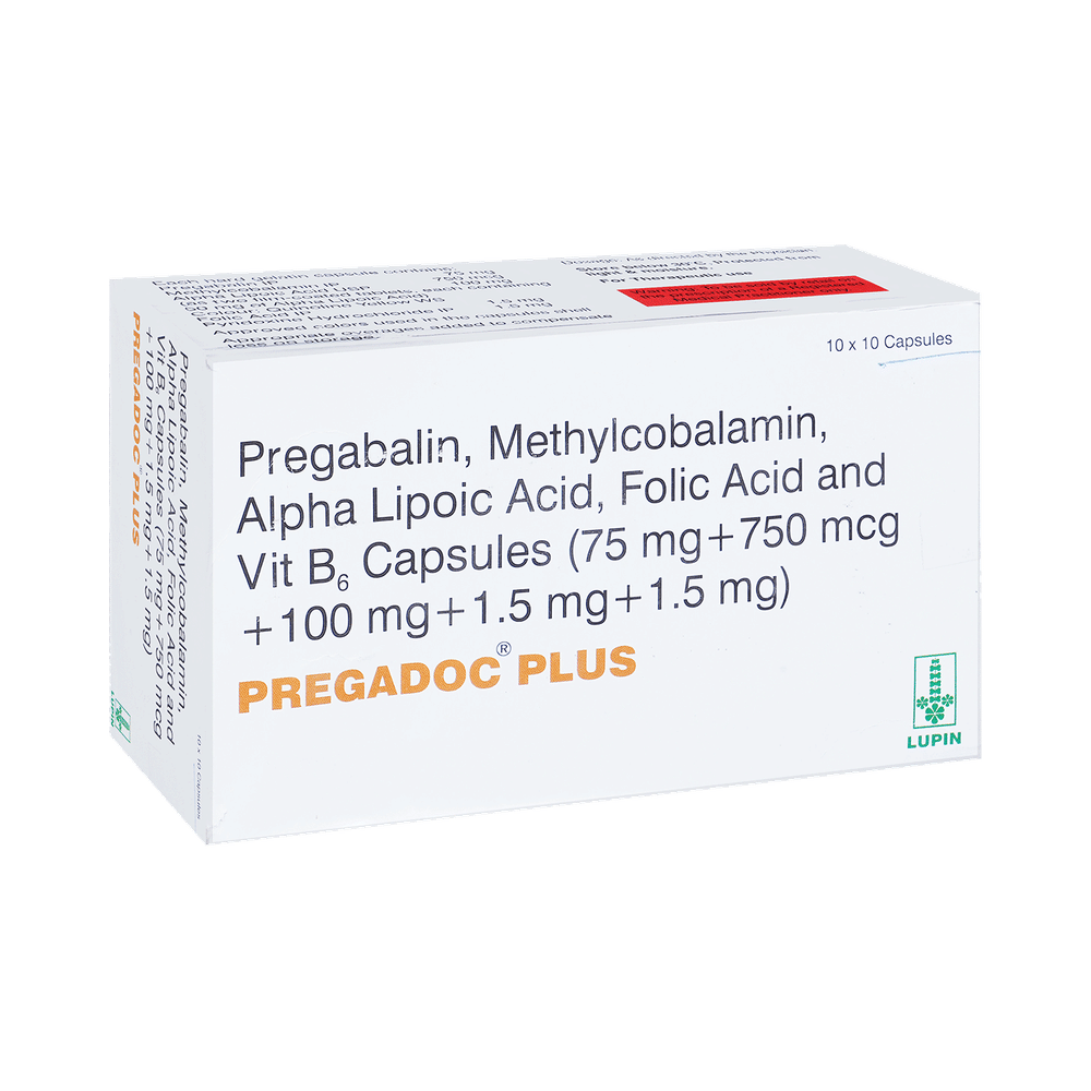 Pregadoc Plus Capsule is a combination of five medicines: Alpha Lipoic Acid, Folic Acid, Methylcobalamin, Pregabalin and Vitamin B6 (Pyridoxine). Alpha Lipoic Acid is a naturally occurring fatty acid which has a protective effect on the brain and nerve tissues. Folic Acid provides essential nutrients to the nerves. Methylcobalamin and Vitamin B6 (Pyridoxine) are forms of vitamin B which help in the production of myelin, a substance that protects nerve fibers and rejuvenates damaged nerve cells. Pregabalin is an alpha 2 delta ligand which decreases pain by modulating calcium channel activity of the nerve cells. Together, they relieve neuropathic pain (pain from damaged nerves).