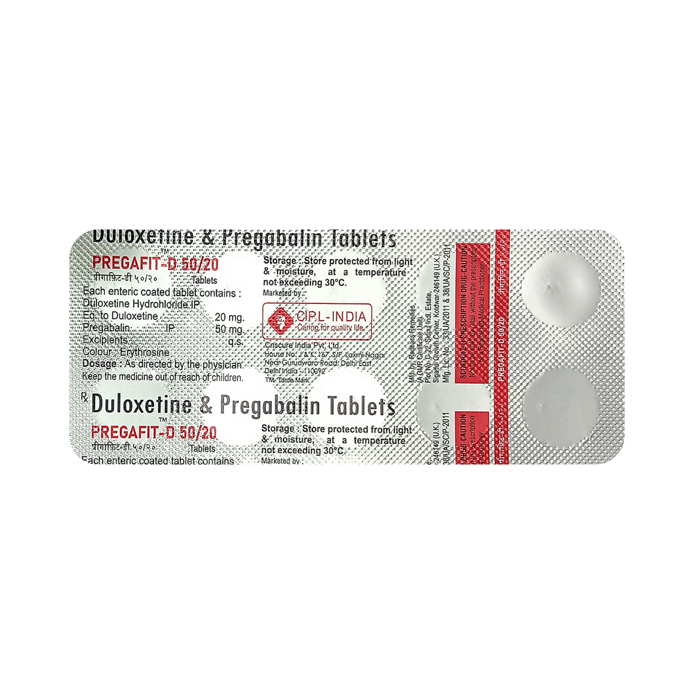 Pregafit-D 50/20 Tablet is a combination of two medicines: pregabalin and duloxetine. Pregabalin decreases neurotransmitter release, while duloxetine boosts serotonin and norepinephrine levels to modulate pain perception, working together to relieve nerve pain.