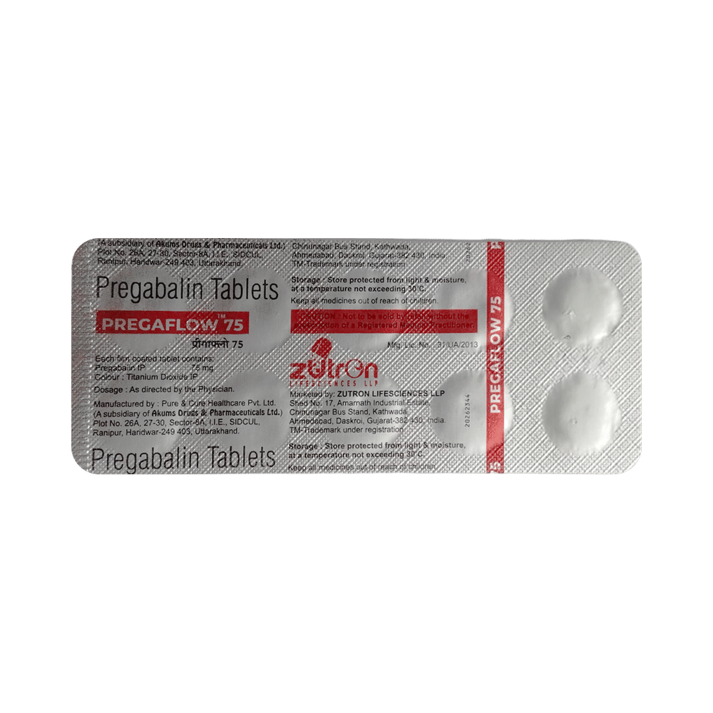 Pregaflow 75 Tablet is a medicine used to relieve pain caused by nerve damage (neuropathic pain) due to diabetes, shingles (herpes zoster infection), spinal cord injury, or other conditions. It is also used to treat widespread muscle pain and stiffness in people with fibromyalgia. Pregaflow 75 Tablet belongs to the anti-epileptic group of medicines and can also be used to treat certain types of seizures (fits) in combination with other medicines. Additionally, it may also be prescribed to treat the symptoms of anxiety disorder if other medicines are not suitable.You can take Pregaflow 75 Tablet with or without food, but it is important to take this medicine at the same time each day to get the most benefit. The exact dose and duration of treatment will depend on your condition and how you respond to it. Your doctor will probably start this medicine at a low dose and increase it gradually. It may take a few weeks for the medicine to work properly. Follow your doctor’s instructions and continue taking it regularly until your doctor advises you to stop. Do not miss any dose, otherwise, your condition may worsen.The side effects of this medicine are usually mild and go away by themselves. The most common ones are feeling sleepy or dizzy, dryness in the mouth, blurred vision, weight gain, edema (swelling over the whole body), and difficulty in concentrating. Most side effects are not serious and do not need medical attention. Talk to your doctor about potential side effects and ways in which you might prevent or cope with them.Before taking the medicine you should tell your doctor if you are pregnant, breastfeeding, or planning to become pregnant. Be careful while driving as sleepiness, dizziness, and blurring of vision may be seen as side effects. You should avoid drinking alcohol along with this medicine as it may lead to excessive sleepiness and dizziness.