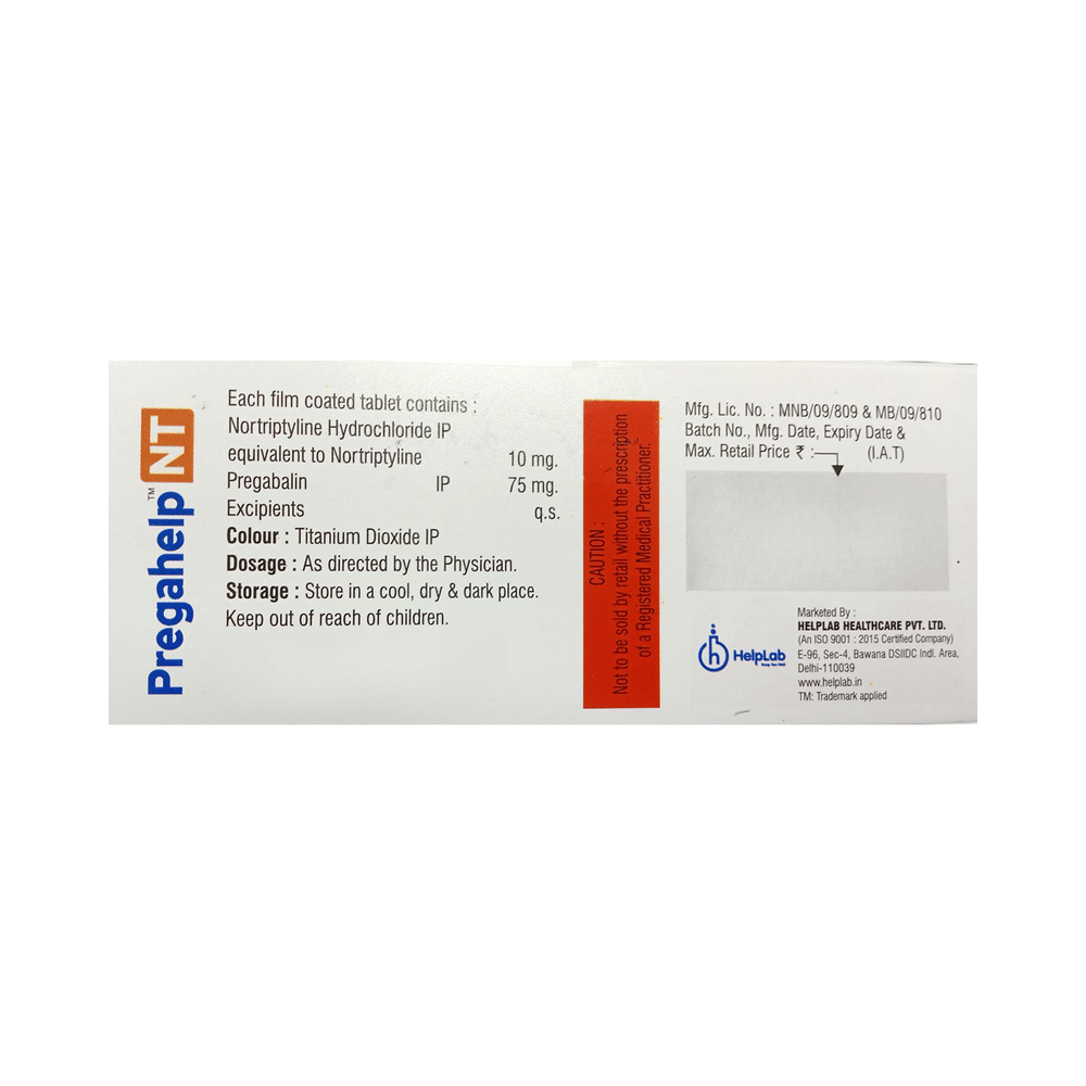 Pregahelp NT Tablet is a combination medicine used for the treatment of neuropathic pain. This medicine decreases the pain by stopping the movement of pain signals to the brain. Pregahelp NT Tablet may be taken with or without food, preferably at bedtime. Take it at the same time each day as this helps to maintain a consistent level of medicine in the blood. Take this medicine in the dose and duration advised by your doctor. If you miss a dose of this medicine, take it as soon as you remember. Finish the complete course of treatment even if you feel better. Do not stop this medication suddenly without talking to the doctor.Some common side effects of this medicine include constipation, nausea, vision disturbance, and excessive sweating. It may also cause dizziness and sleepiness. So, do not drive or do anything that requires mental focus until you know how this medicine affects you. This medicine may cause weight gain, and to control it, you should exercise regularly and have a balanced diet. It is important to inform your doctor if you develop any unusual changes in mood or behavior, new or worsening depression, or suicidal thoughts.Before taking Pregahelp NT Tablet, let your doctor know if you suffer from kidney or liver disease. Your doctor should also know about all other medicines you are taking, as many of these may make this medicine less effective or change the way it works. Inform your doctor if you are pregnant, planning pregnancy, or breastfeeding.