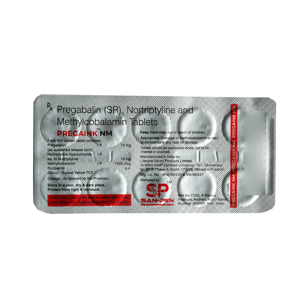 Pregaink NM Tablet SR is a combination of three medicines: Pregabalin, Nortriptyline and Methylcobalamin. Pregabalin is an alpha 2 delta ligand which decreases pain by modulating calcium channel activity of the nerve cells. Nortriptyline is a tricyclic antidepressant which increases the levels of chemical messengers (serotonin and noradrenaline) that stop the movement of pain signals in the brain. Methylcobalamin is a form of vitamin B which helps in the production of myelin, a substance that protects nerve fibers and rejuvenates damaged nerve cells. Together, they relieve neuropathic pain (pain from damaged nerves).