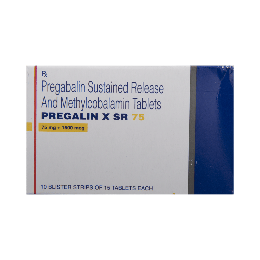 Pregalin X SR 75 Tablet is a prescription medicine used for the treatment of neuropathic pain. It decreases pain by modulating the calcium channel activity of the nerve cells. This medicine also protects nerve fibers and heals damaged nerve cells. Pregalin X SR 75 Tablet may be taken with or without food, preferably at bedtime. It is advised to take it at the same time each day as this helps to maintain a consistent level of medicine in the body. Take this medicine in the dose and duration advised by your doctor. If you miss a dose of this medicine, take it as soon as you remember. Finish the full course of treatment even if you feel better. This medication must not be stopped suddenly without talking to the doctor.Some common side effects of this medicine include nausea, vomiting, diarrhea, constipation, blurred vision, dizziness, and sleepiness. Do not drive or do anything that requires mental focus until you know how this medicine affects you. The side effects are mild and usually improve with time. It may also cause weight gain in some people. Exercise regularly and have a balanced diet to keep your weight in check. Inform your doctor if you develop any unusual changes in mood or behavior, new or worsening depression, or suicidal thoughts.Your doctor should also know about all other medicines you are taking, as many of these may make this medicine less effective or change the way it works. Inform your doctor if you are pregnant, planning pregnancy, or breastfeeding to make sure it is safe for you and the developing baby.