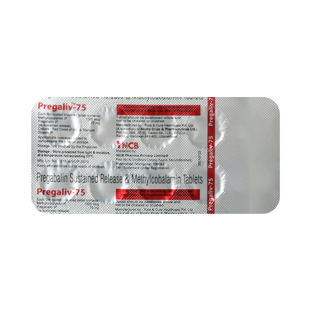 Pregaliv 75 Tablet SR is a combination of two medicines: Methylcobalamin and Pregabalin. Methylcobalamin is a form of vitamin B, which helps in the production of myelin, a substance that protects nerve fibers and rejuvenates damaged nerve cells. Pregabalin is an alpha-2 delta ligand that decreases pain by modulating the calcium channel activity of the nerve cells. Together, they relieve neuropathic pain (pain from damaged nerves).