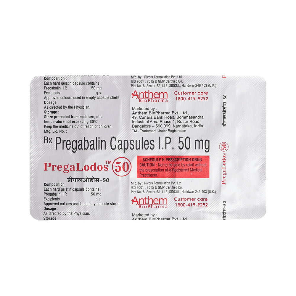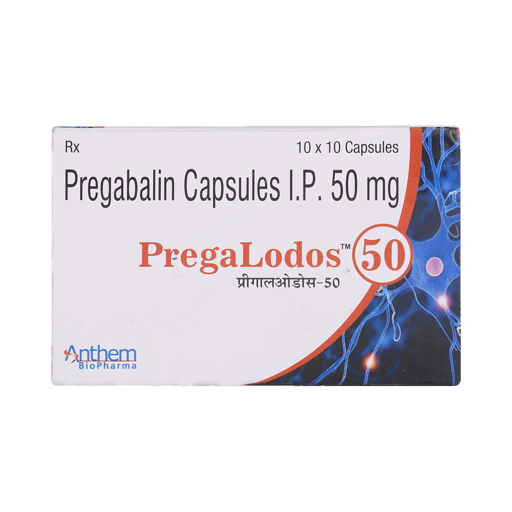 Pregalodos 50mg Capsule is a medicine used to relieve pain caused by nerve damage (neuropathic pain) due to diabetes, shingles (herpes zoster infection), spinal cord injury, or other conditions. It is also used to treat widespread muscle pain and stiffness in people with fibromyalgia. Pregalodos 50mg Capsule belongs to the anti-epileptic group of medicines and can also be used to treat certain types of seizures (fits) in combination with other medicines. Additionally, it may also be prescribed to treat the symptoms of anxiety disorder if other medicines are not suitable.You can take Pregalodos 50mg Capsule with or without food, but it is important to take this medicine at the same time each day to get the most benefit. The exact dose and duration of treatment will depend on your condition and how you respond to it. Your doctor will probably start this medicine at a low dose and increase it gradually. It may take a few weeks for the medicine to work properly. Follow your doctor’s instructions and continue taking it regularly until your doctor advises you to stop. Do not miss any dose, otherwise, your condition may worsen.The side effects of this medicine are usually mild and go away by themselves. The most common ones are feeling sleepy or dizzy, dryness in the mouth, blurred vision, weight gain, edema (swelling over the whole body), and difficulty in concentrating. Most side effects are not serious and do not need medical attention. Talk to your doctor about potential side effects and ways in which you might prevent or cope with them.Before taking the medicine you should tell your doctor if you are pregnant, breastfeeding, or planning to become pregnant. Be careful while driving as sleepiness, dizziness, and blurring of vision may be seen as side effects. You should avoid drinking alcohol along with this medicine as it may lead to excessive sleepiness and dizziness.