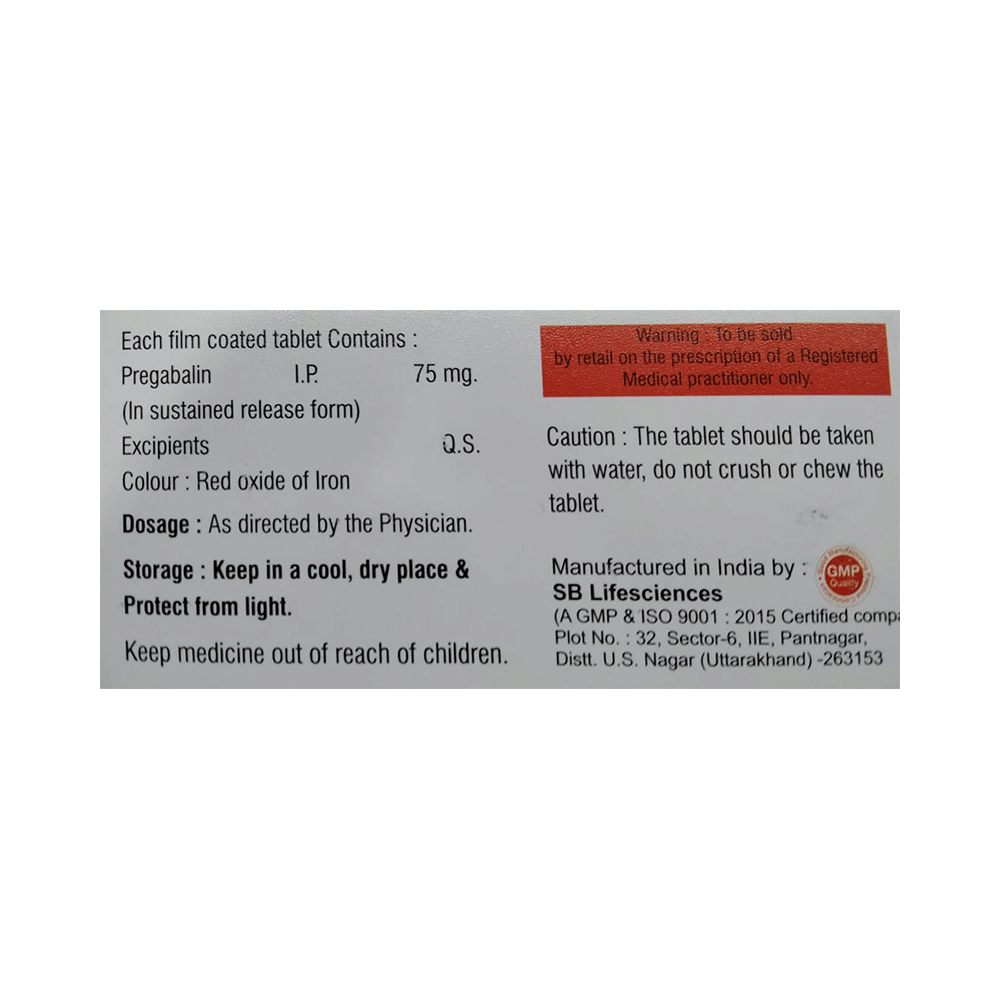 Preganis SR 75 Tablet is a medicine used to relieve pain caused by nerve damage (neuropathic pain) due to diabetes, shingles (herpes zoster infection), spinal cord injury, or other conditions. It is also used to treat widespread muscle pain and stiffness in people with fibromyalgia. Preganis SR 75 Tablet belongs to the anti-epileptic group of medicines and can also be used to treat certain types of seizures (fits) in combination with other medicines. Additionally, it may also be prescribed to treat the symptoms of anxiety disorder if other medicines are not suitable.You can take Preganis SR 75 Tablet with or without food, but it is important to take this medicine at the same time each day to get the most benefit. The exact dose and duration of treatment will depend on your condition and how you respond to it. Your doctor will probably start this medicine at a low dose and increase it gradually. It may take a few weeks for the medicine to work properly. Follow your doctor’s instructions and continue taking it regularly until your doctor advises you to stop. Do not miss any dose, otherwise, your condition may worsen.The side effects of this medicine are usually mild and go away by themselves. The most common ones are feeling sleepy or dizzy, dryness in the mouth, blurred vision, weight gain, edema (swelling over the whole body), and difficulty in concentrating. Most side effects are not serious and do not need medical attention. Talk to your doctor about potential side effects and ways in which you might prevent or cope with them.Before taking the medicine you should tell your doctor if you are pregnant, breastfeeding, or planning to become pregnant. Be careful while driving as sleepiness, dizziness, and blurring of vision may be seen as side effects. You should avoid drinking alcohol along with this medicine as it may lead to excessive sleepiness and dizziness.
