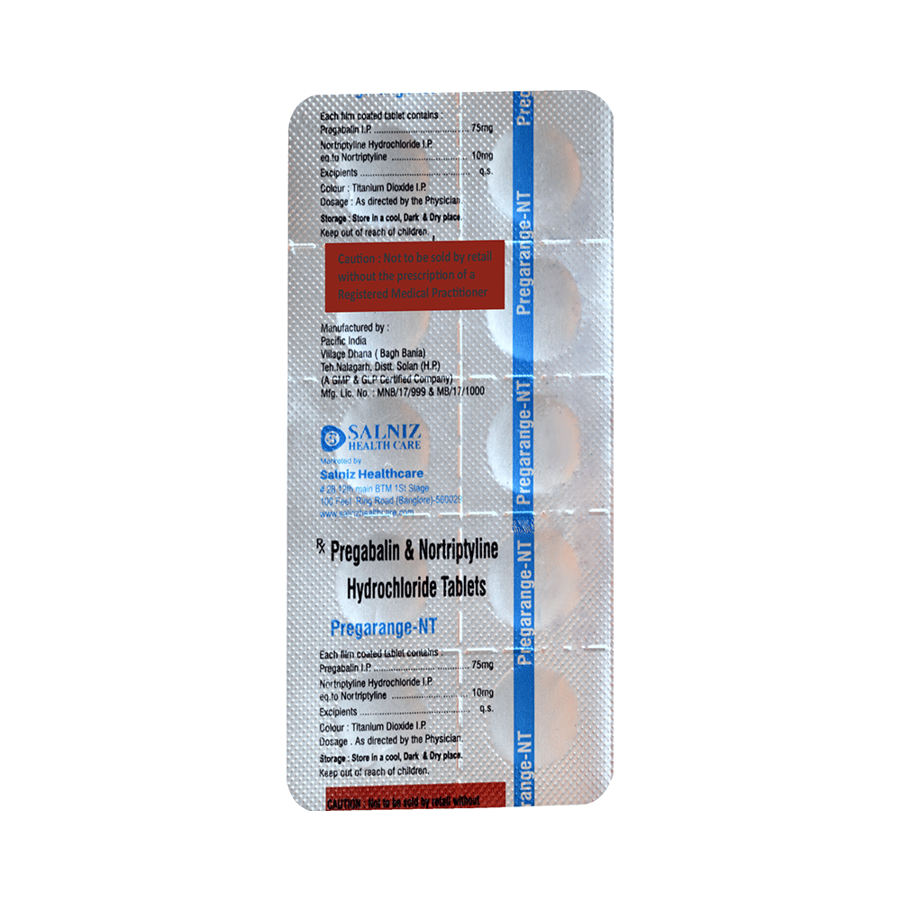 Pregarange-NT 75mg/10mg Tablet is a combination of two medicines: Pregabalin and Nortriptyline. Pregabalin is an alpha-2 delta ligand that decreases pain by modulating the calcium channel activity of the nerve cells. Nortriptyline is a tricyclic antidepressant that increases the levels of chemical messengers (serotonin and noradrenaline) that stop the movement of pain signals in the brain. Together, they relieve neuropathic pain (pain from damaged nerves).