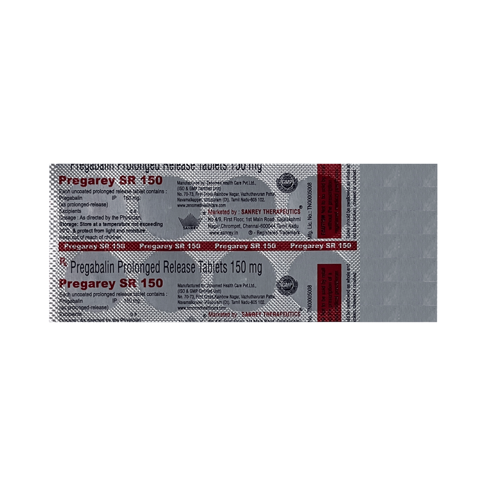 Pregarey SR 150 Tablet is a medicine used to relieve pain caused by nerve damage (neuropathic pain) due to diabetes, shingles (herpes zoster infection), spinal cord injury, or other conditions. It is also used to treat widespread muscle pain and stiffness in people with fibromyalgia. Pregarey SR 150 Tablet belongs to the anti-epileptic group of medicines and can also be used to treat certain types of seizures (fits) in combination with other medicines. Additionally, it may also be prescribed to treat the symptoms of anxiety disorder if other medicines are not suitable.You can take Pregarey SR 150 Tablet with or without food, but it is important to take this medicine at the same time each day to get the most benefit. The exact dose and duration of treatment will depend on your condition and how you respond to it. Your doctor will probably start this medicine at a low dose and increase it gradually. It may take a few weeks for the medicine to work properly. Follow your doctor’s instructions and continue taking it regularly until your doctor advises you to stop. Do not miss any dose, otherwise, your condition may worsen.The side effects of this medicine are usually mild and go away by themselves. The most common ones are feeling sleepy or dizzy, dryness in the mouth, blurred vision, weight gain, edema (swelling over the whole body), and difficulty in concentrating. Most side effects are not serious and do not need medical attention. Talk to your doctor about potential side effects and ways in which you might prevent or cope with them.Before taking the medicine you should tell your doctor if you are pregnant, breastfeeding, or planning to become pregnant. Be careful while driving as sleepiness, dizziness, and blurring of vision may be seen as side effects. You should avoid drinking alcohol along with this medicine as it may lead to excessive sleepiness and dizziness.