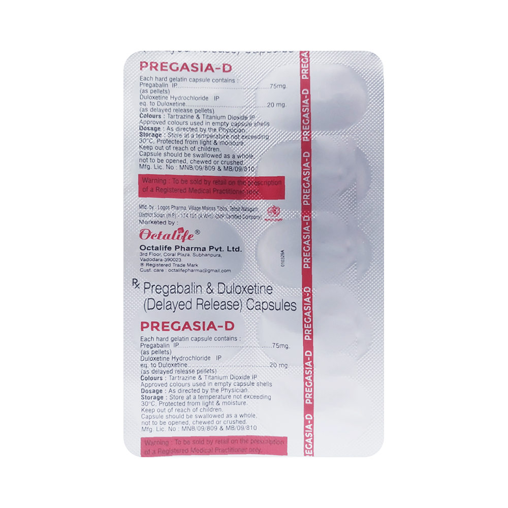 Pregasia-D Capsule DR is a combination of two medicines: pregabalin and duloxetine. Pregabalin decreases neurotransmitter release, while duloxetine boosts serotonin and norepinephrine levels to modulate pain perception, working together to relieve nerve pain.