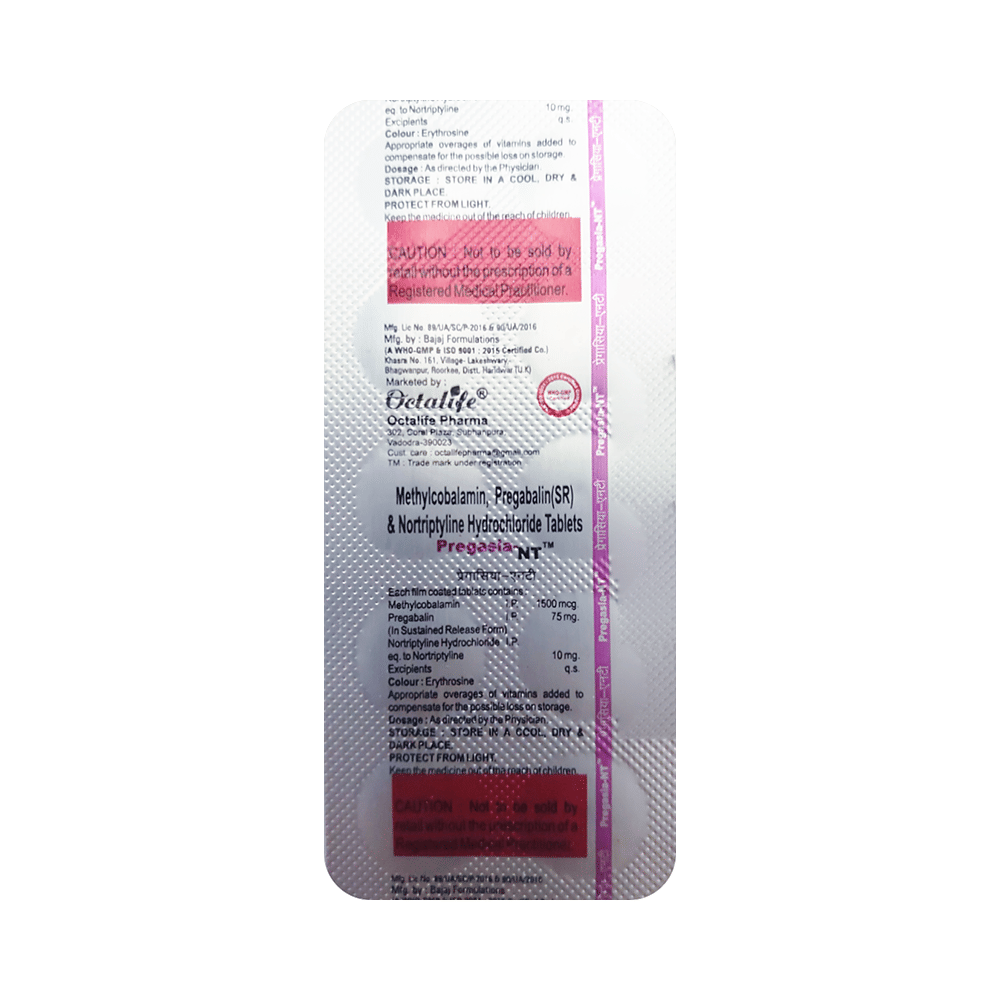 Pregasia-NT Tablet SR is a combination of three medicines: Pregabalin, Nortriptyline and Methylcobalamin. Pregabalin is an alpha 2 delta ligand which decreases pain by modulating calcium channel activity of the nerve cells. Nortriptyline is a tricyclic antidepressant which increases the levels of chemical messengers (serotonin and noradrenaline) that stop the movement of pain signals in the brain. Methylcobalamin is a form of vitamin B which helps in the production of myelin, a substance that protects nerve fibers and rejuvenates damaged nerve cells. Together, they relieve neuropathic pain (pain from damaged nerves).