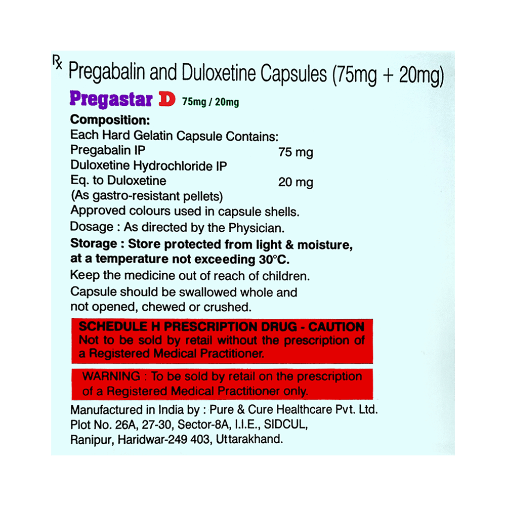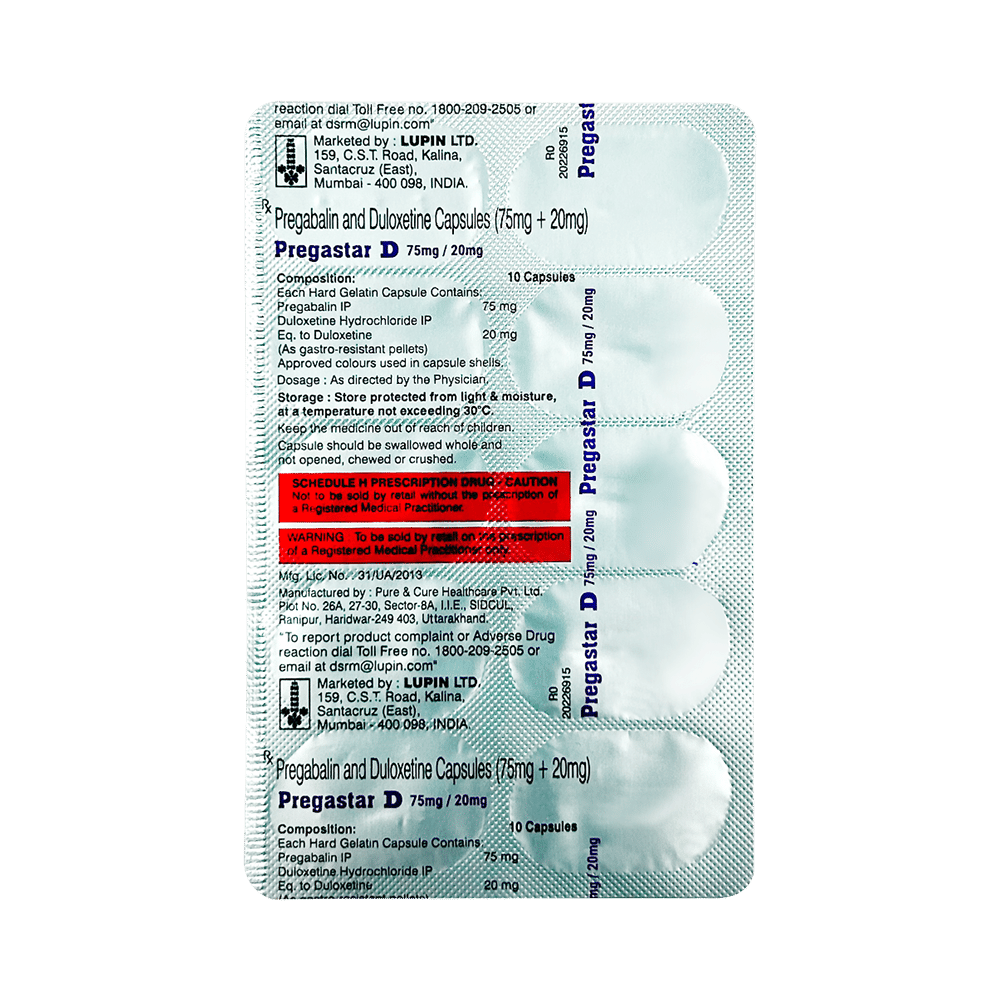 Pregastar D 75mg/20mg Capsule is a combination of two medicines: pregabalin and duloxetine. Pregabalin decreases neurotransmitter release, while duloxetine boosts serotonin and norepinephrine levels to modulate pain perception, working together to relieve nerve pain.