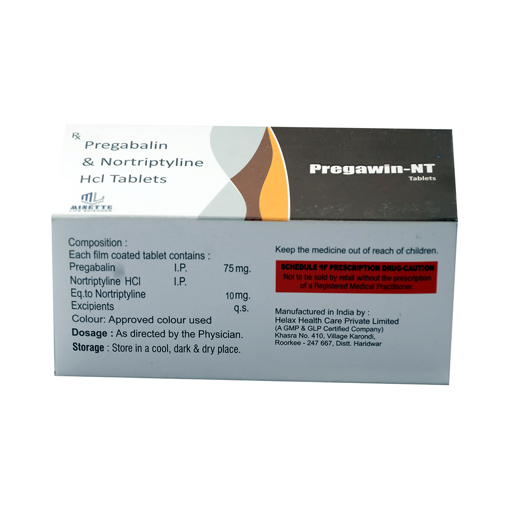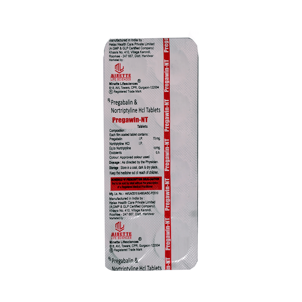 Pregawin-NT Tablet is a combination of two medicines: Pregabalin and Nortriptyline. Pregabalin is an alpha-2 delta ligand that decreases pain by modulating the calcium channel activity of the nerve cells. Nortriptyline is a tricyclic antidepressant that increases the levels of chemical messengers (serotonin and noradrenaline) that stop the movement of pain signals in the brain. Together, they relieve neuropathic pain (pain from damaged nerves).