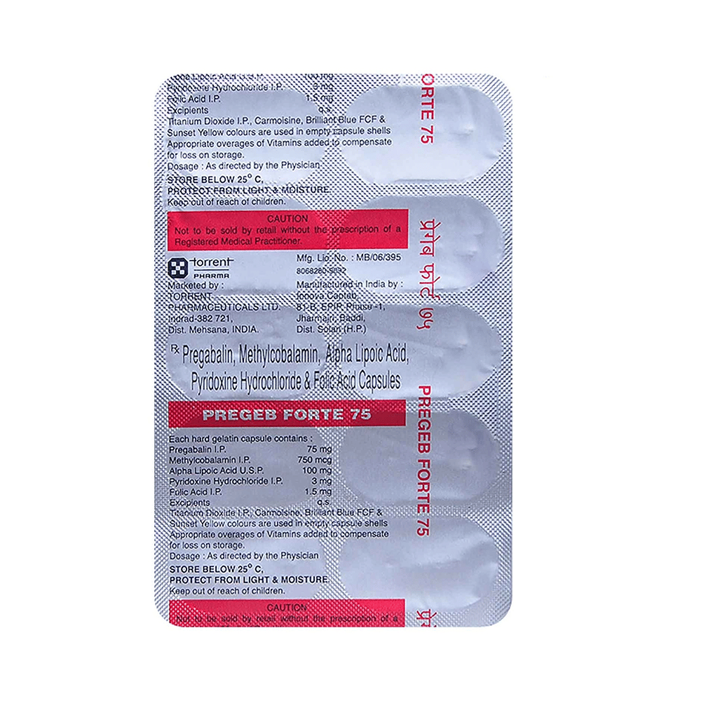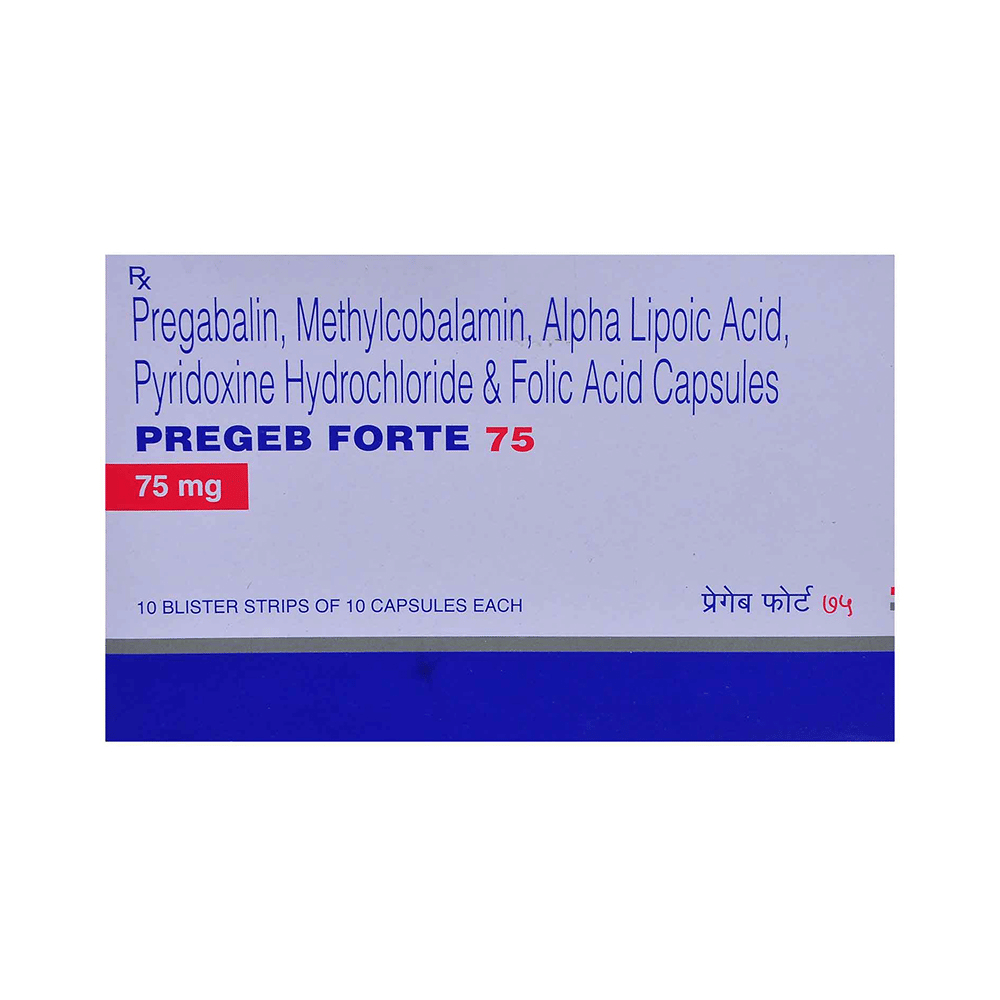 Pregeb Forte 75 Capsule is used to treat neuropathic pain. It decreases the pain by controlling calcium channel activity and by decreasing the production of a substance that protects nerve fibers and rejuvenates damaged nerve cells. Pregeb Forte 75 Capsule can be taken on empty stomach. However, it is advised to take it at the same time each day as this helps to maintain a consistent level of medicine in the body. Take this medicine in the dose and duration advised by your doctor. If you miss a dose of this medicine, take it as soon as you remember. Finish the full course of treatment even if you feel better. It is important not to stop taking this medicine suddenly without talking to the doctor.Common side effects of this medicine include dizziness and sleepiness, so do not drive or do anything that requires mental focus until you know how this medicine affects you. It may also cause nasopharyngitis, increased appetite, confusion, difficulty in sleeping, decreased libido, tremor, vision blurred, and vertigo. Inform your doctor if you develop any unusual changes in the mood or behavior, new or worsening depression, or suicidal thoughts. It is better to avoid alcohol while taking this medicine as it can enhance the dizziness effect of the drug.Your doctor should also know about all other medicines you are taking as many of these may make this medicine less effective or change the way it works. Inform your doctor if you are pregnant, planning pregnancy or breastfeeding.