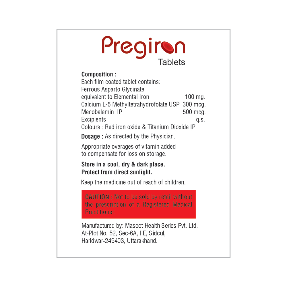 Pregiron Tablet is a combination of three medicines : L-Methyl Folate, Methylcobalamin, and Iron. L-methylfolate is the primary biologically active isomer of folic acid and the primary form of folate in circulation. Folic Acid is a form of vitamin B. It plays a vital role in the formation of red blood cells, which carry oxygen throughout the body. It is also essential in pregnancy due to its role in the development of the unborn baby's brain and spinal cord. Methylcobalamin is a form of vitamin B12 that restores its level in the body thereby helping in treating certain anemias and nerve problems. Iron is vital for the formation of new red blood cells and hemoglobin, a substance that gives these cells the ability to transport oxygen.