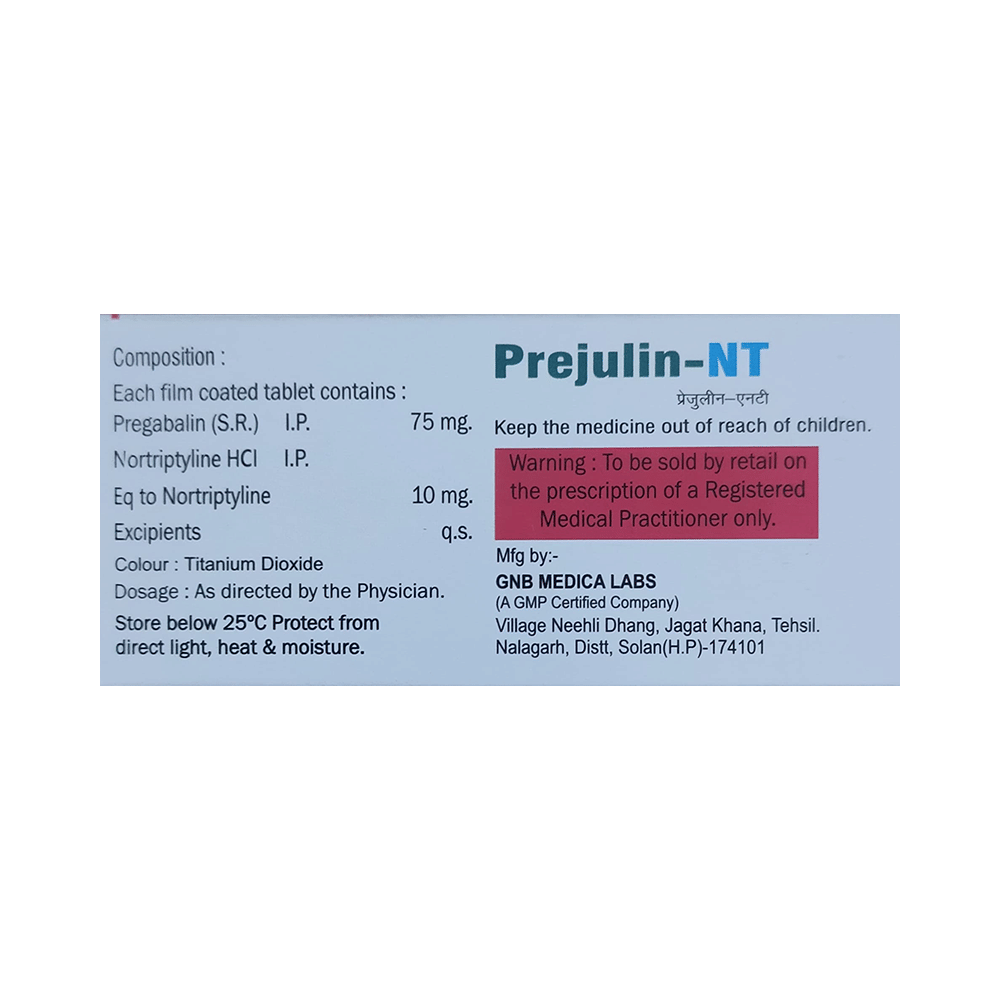 Prejulin-NT Tablet is a combination of two medicines: Pregabalin and Nortriptyline. Pregabalin is an alpha-2 delta ligand that decreases pain by modulating the calcium channel activity of the nerve cells. Nortriptyline is a tricyclic antidepressant that increases the levels of chemical messengers (serotonin and noradrenaline) that stop the movement of pain signals in the brain. Together, they relieve neuropathic pain (pain from damaged nerves).